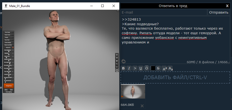 >>319694 Вообще ахуеваю с этих советов про анатомию, я хуячу средние по качеству ебальники(не прям крутан, но и сами ебальники уже не как у фантомаса), а вот когда собираюсь сделать хуману одежду, то начинается жопная боль Я бы рад был и просто на человечка из зсфер хуячить пикрил одежду, но человечек, даже с детализацией и правилными пропорциями, намного легче, чем этот ад