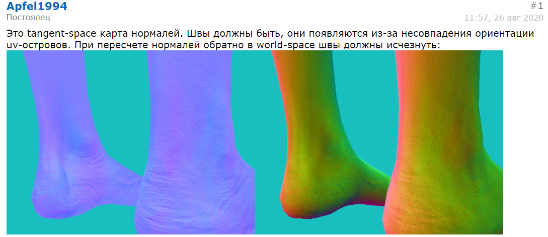 >>326655 >Пик 1 вычитал в инете, как это применить к пику 2? Чтобы пиздецовые ювшвы убрать? Ну тебе же чел на 1ом пике написал, что в этом нет проблемы - это просто ориентация ЮВ островов. Это векторная информация - это не для вас молодой человек, а для шейдера. Примени нормалку к самой модели в правильный слот. В альбедо поставь нейтральный серый и смотри что получилось. Если при такой конфигурации швов не видно, значит их и не будет. Если кейдж где-то вылез, на нормалке появляються в этих местах пятна. Вот их лучше осмотри. Ебстить под микроскопом с совмещением хайпольки с лоуполькой тоже не надо. Все там нормально печется. Просто ты опять хуйей страдаешь за чем-то. Покажи лучше нормалку прям квадратом целиковым. Тогда будет и предмет разговора. А по кускам скринов хуй поймешь че там у теб происходит. Мы не экстрасенсы.