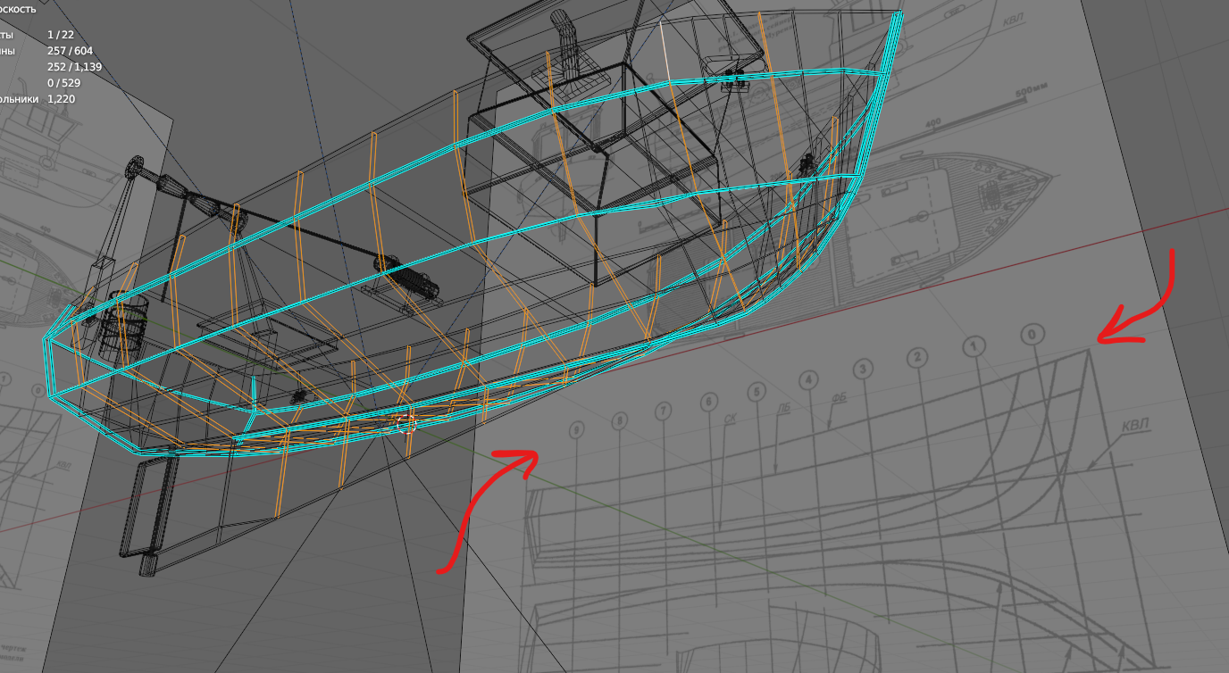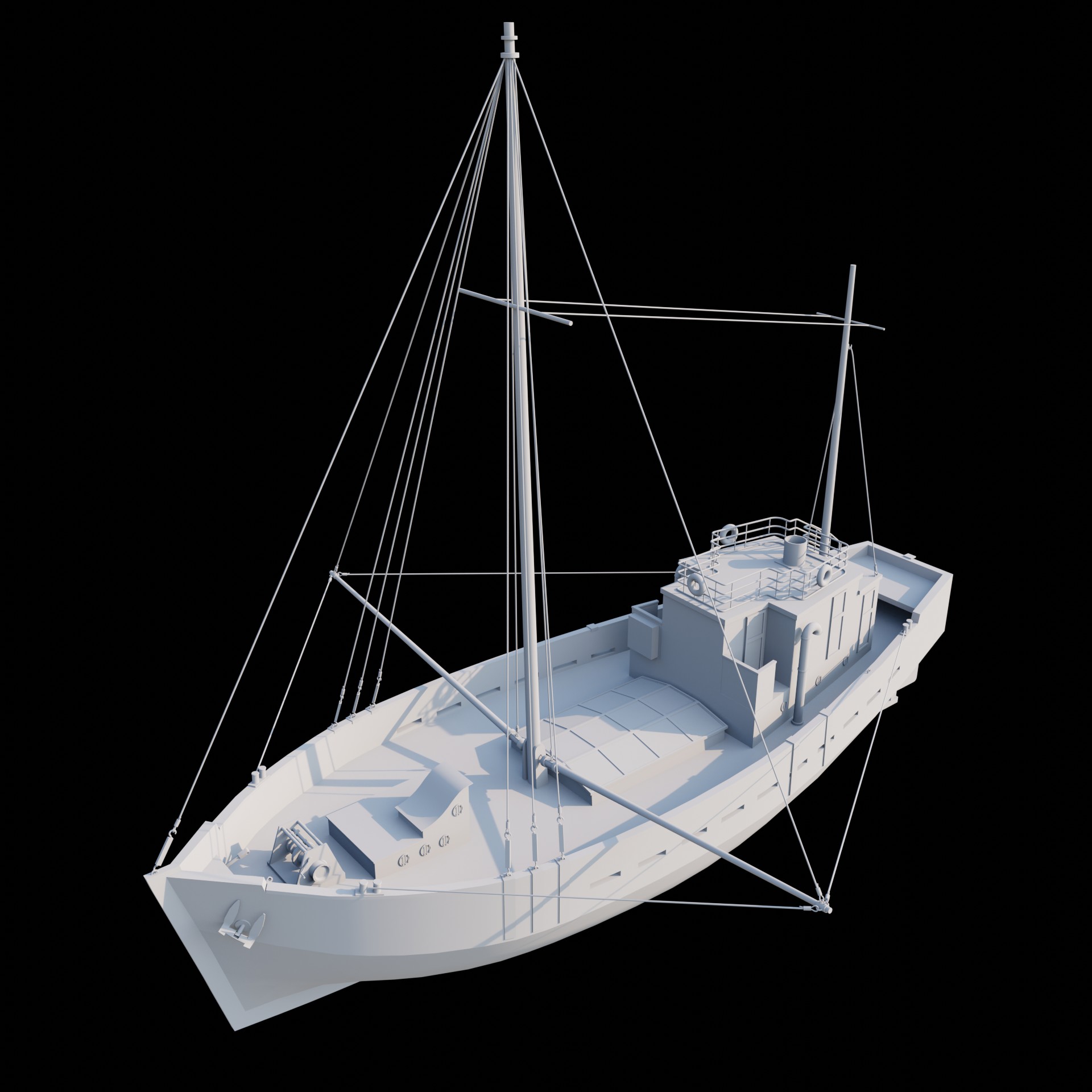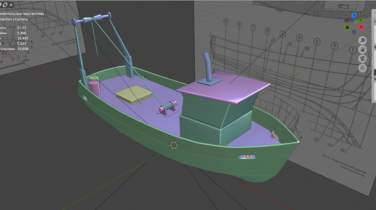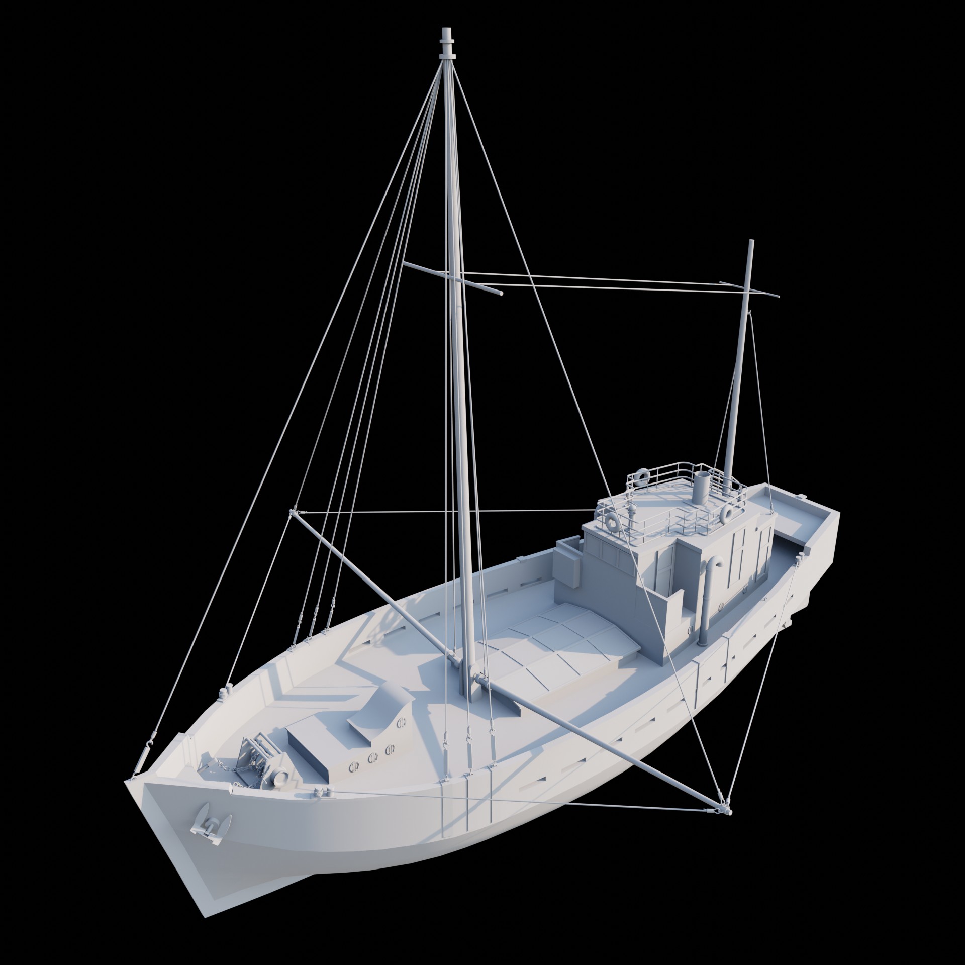 Заебался. Когда запустил рендер, понял что забыл якорные цепи и вентиль под килем - явный признак, что надо передохнуть. Вернусь пока к более простому катеру. Эти два кораблика делал кстати немного по разному. Вот этот на пике - вылепил корпус из куба как был. Накидал лупов и скейлами потягал в пространстве. В катере сделал ребра-шпангоуты, по чертежу, потом бриджами создал бортовые грани. Забавно, что решил сделать кораблики для практики текстурирования в SP, а щас даже не представляю когда до него доберусь.