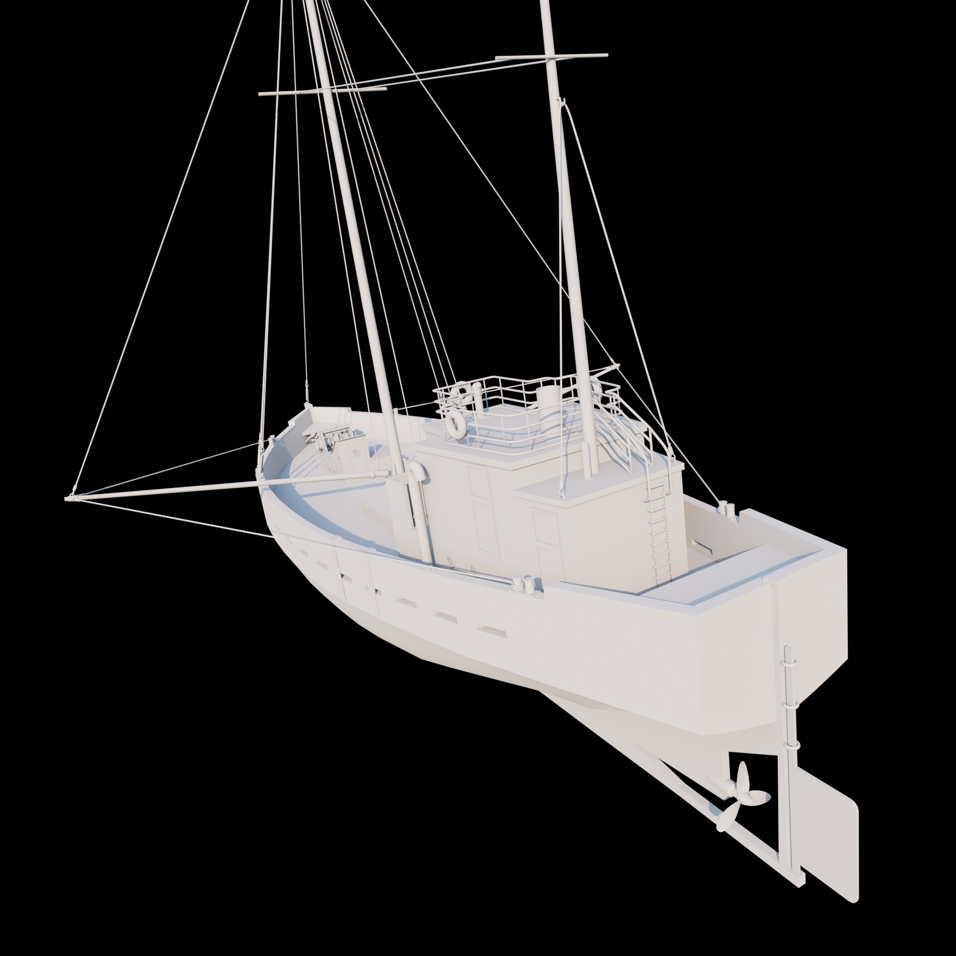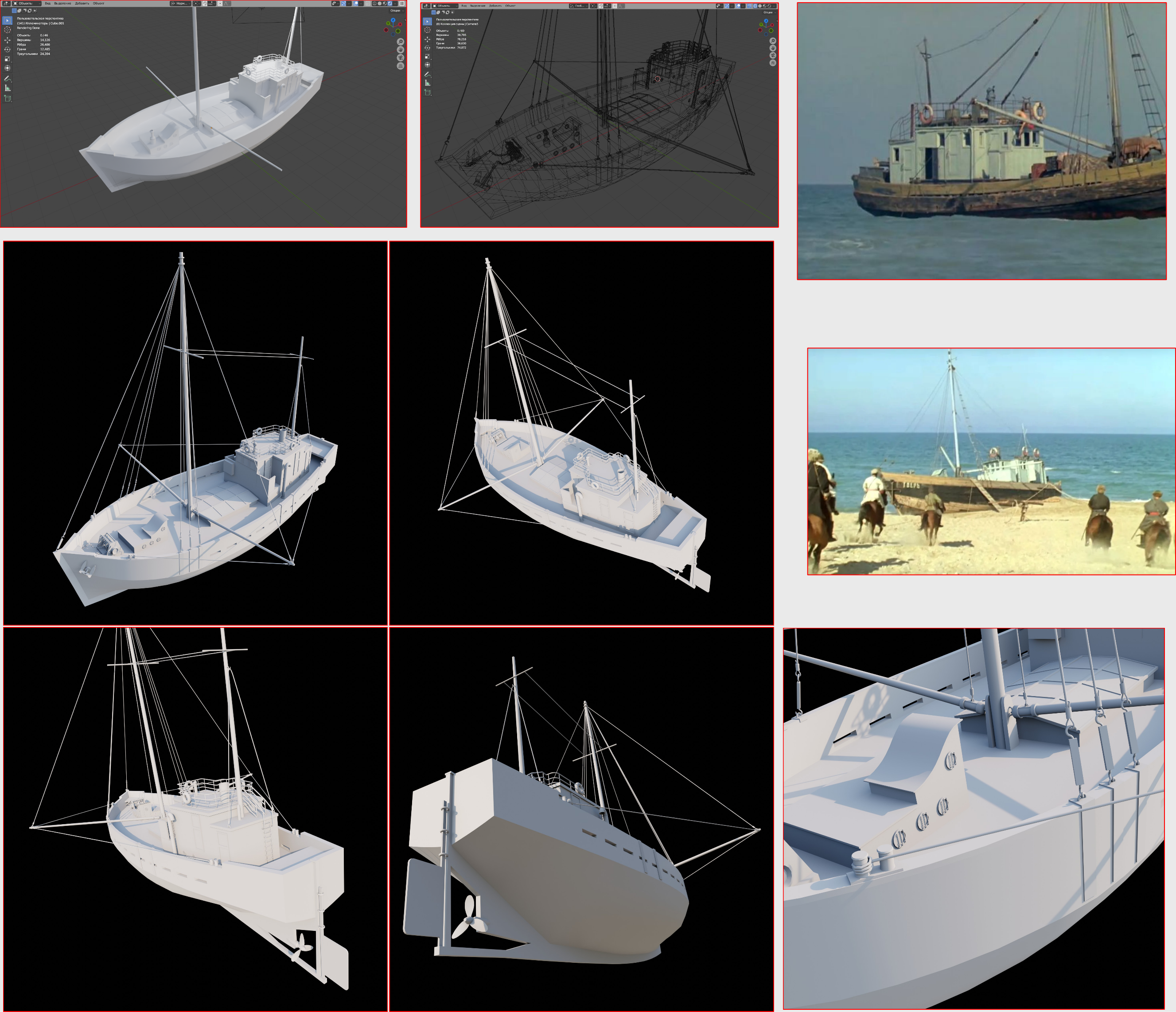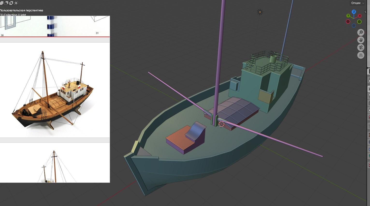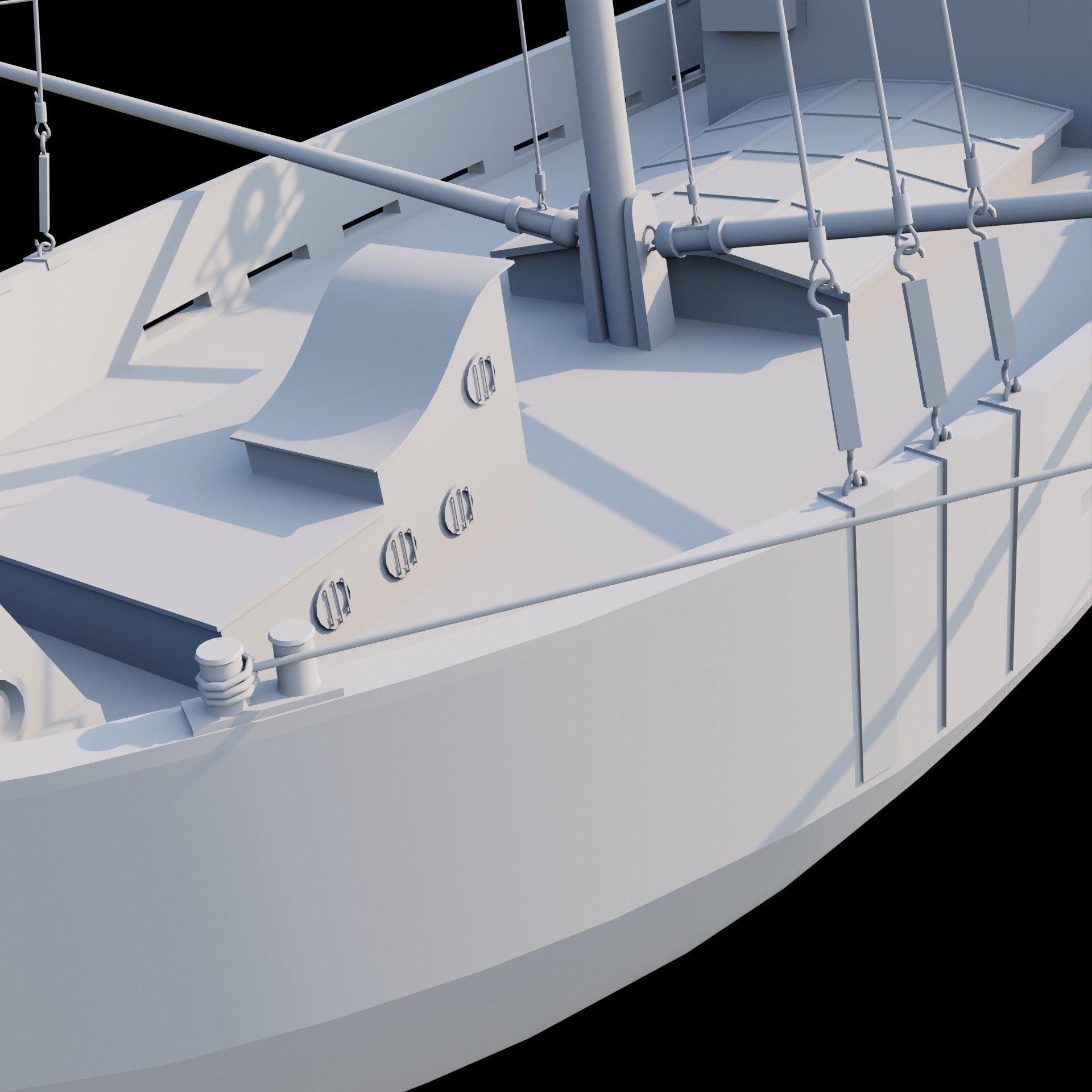 Заебался. Когда запустил рендер, понял что забыл якорные цепи и вентиль под килем - явный признак, что надо передохнуть. Вернусь пока к более простому катеру. Эти два кораблика делал кстати немного по разному. Вот этот на пике - вылепил корпус из куба как был. Накидал лупов и скейлами потягал в пространстве. В катере сделал ребра-шпангоуты, по чертежу, потом бриджами создал бортовые грани. Забавно, что решил сделать кораблики для практики текстурирования в SP, а щас даже не представляю когда до него доберусь.