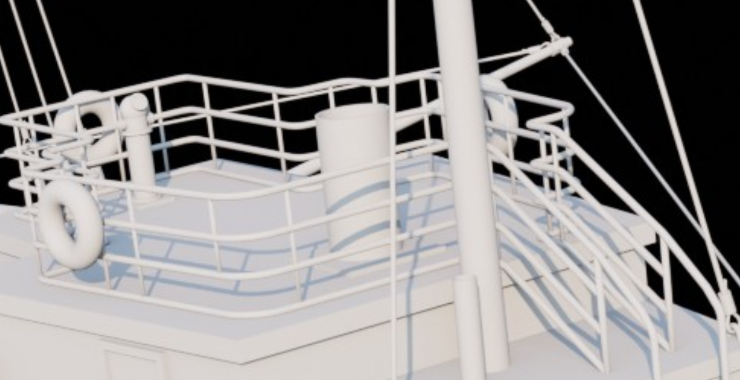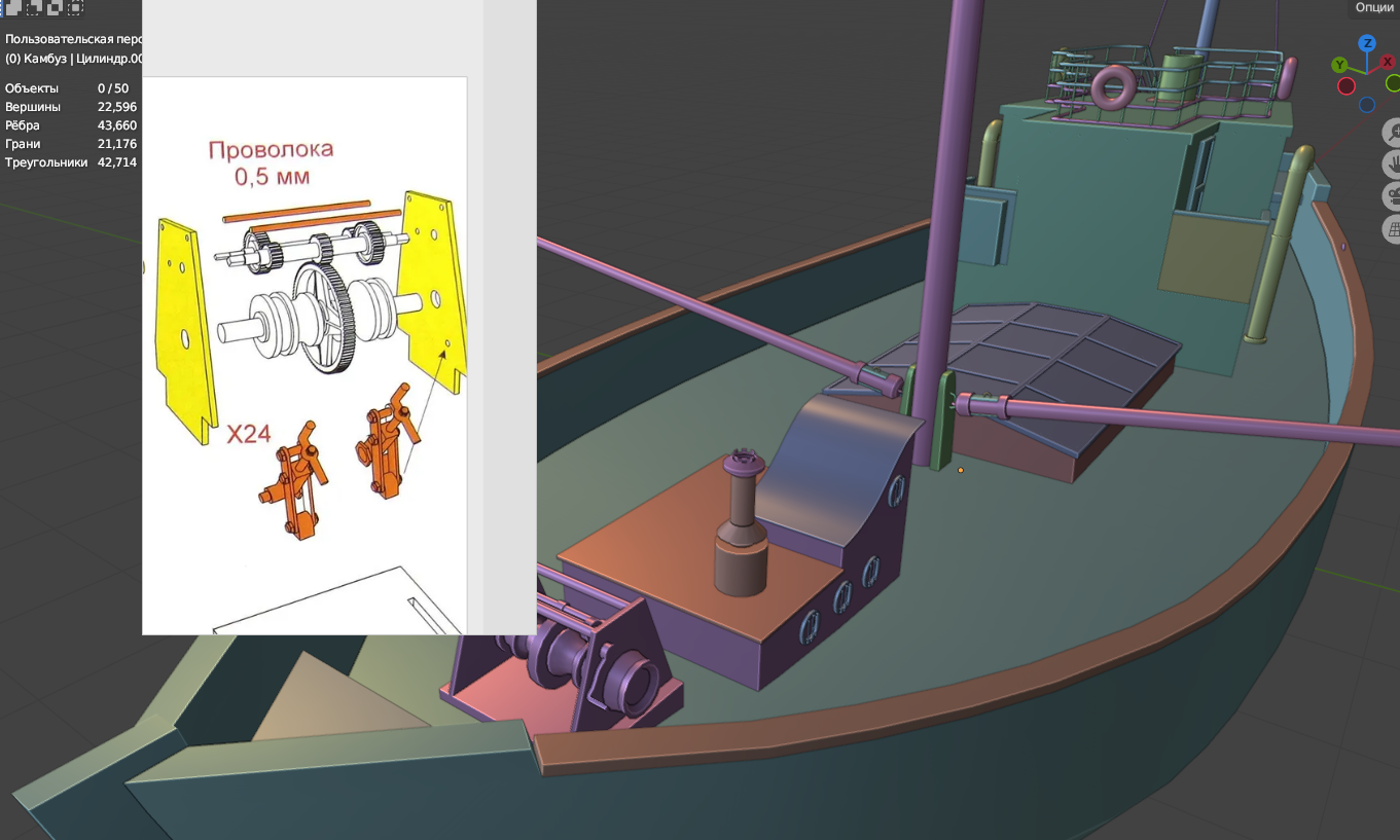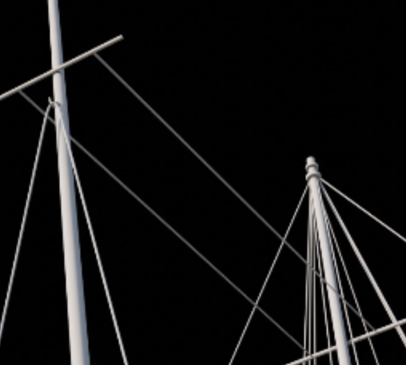 В целом я не стремился к прям реализму, поэтому сознательно делал примерно похоже а не точно. То есть канат в реальности крепится через морской узел обмотанный вокруг той двухрогой штуки на фальшборте, а я просто повесил на рог спираль и подтащил край троса к ней. Издали похуй.