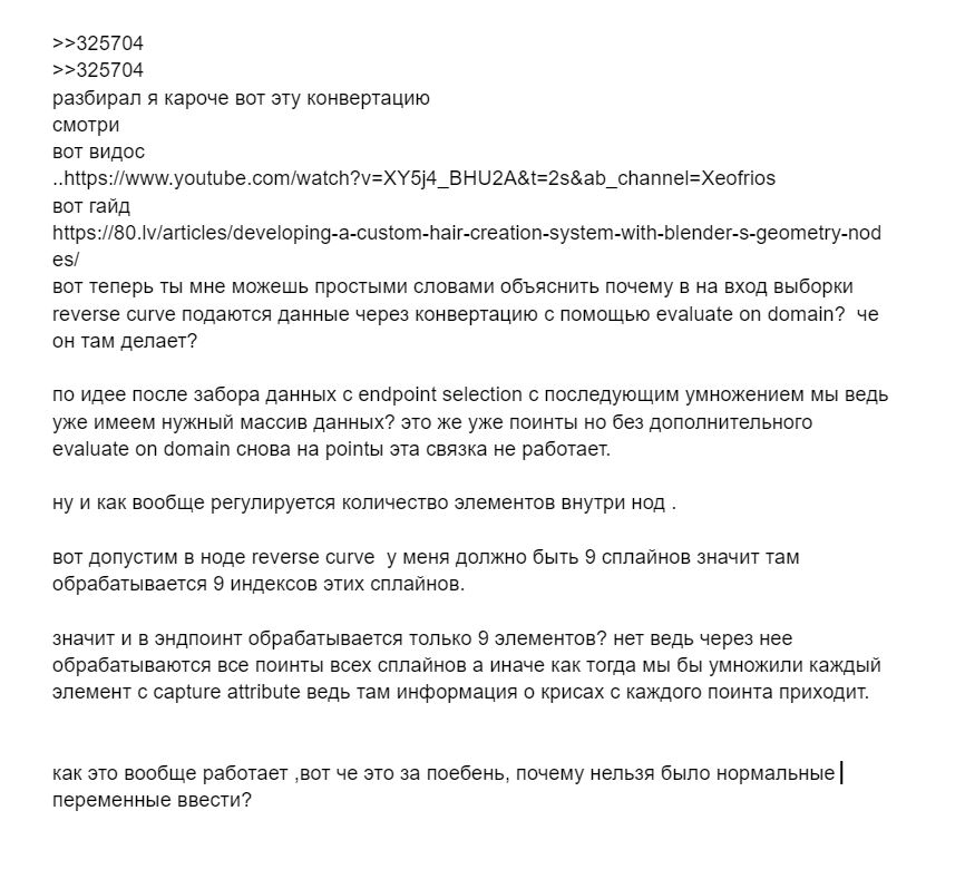 >>325688 >че творится с людьми при использовании геонод вообще не в зуб ногой в программировании я хуй знает. То же самое, что и с тобой, очевидно. Это система заранее с прицелом на функционал в условиях кризиса компетенции, когда разрабатывать будут паджиты и наносеки с задрищенсков, не выучившие ни одного языка, ни машинного, ни человеческого. Таким, очевидно, не нужна вся та инфа, касательно того, что, что происходит внутри нод, потому что они один хуй не поймут ее, поэтому ее и нету, зато есть много дырок, в которые можно тянуть лапшу. Потому что если чел не может выучить синтаксис, логику, матан и т.д., то и не сможет, зато если он долго возился в блендере и выучил весь его функционал, то он сможет по названиям слотов примерно почувствовать, что с чем соотносится и уже в пределах этих параметров наугад протягивая лапшу накликать нужные результаты.