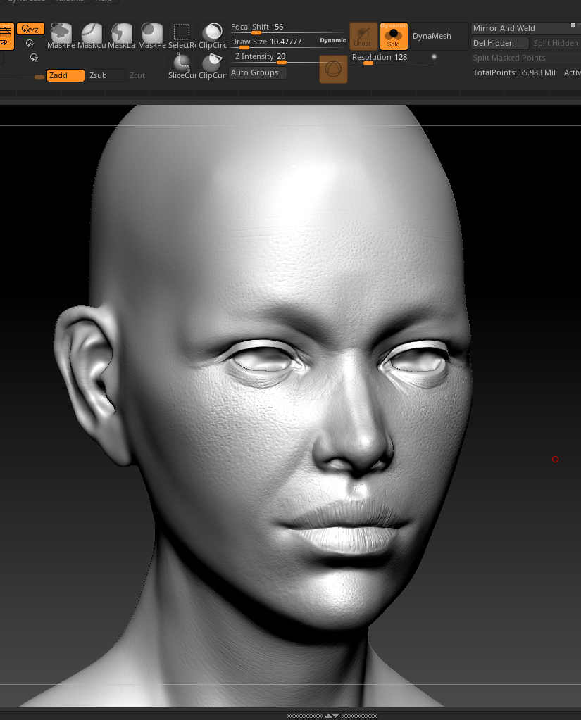 Поэтому скульпти сразу по красоте с сомкнутыми губами, а если тебе окажется нужна полость рта, то уже после ретопологии делай милипиздрический луп там где губы смыкаются и из этой щели экструдь полость. Да, при этом варианте ты окажешься без скульпта нёба, но это и так тебе в 99.9% нахер не нужно будет, да и тогда легче на ювишке в уголке что-то нарисовать/зафотошопить. По поводу десен-зубов и языка не парься, их, если тебе даж реализм нужен, никто в один меш с головой не делают. Отдельными мешами всегда.