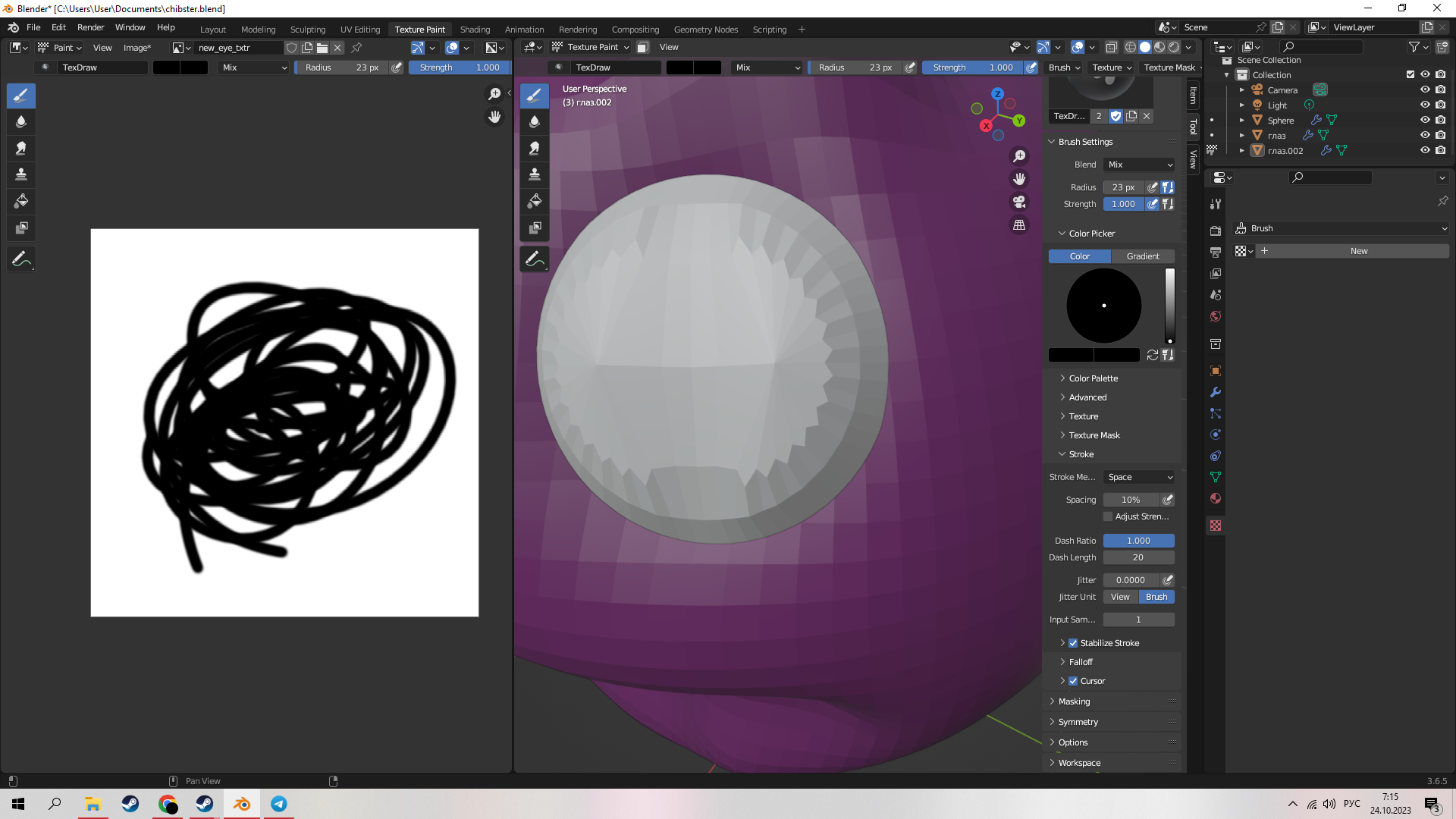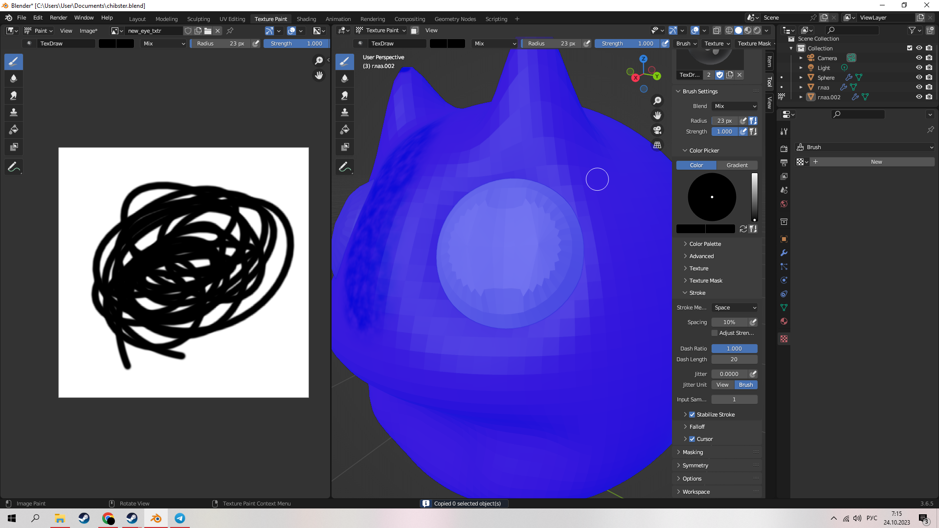 сап. вкатываюсь в блендер, делаю какие-то модельки для себя, красил текстурку и тут кисть сломалась... Если быть точнее, то нанесенные цвета просто не отображаются на текстуре, но если залить - цвет меняется. Если рисовать на самой текстуре, толку ноль. С нормалями все в порядке(если правильно все понял из видоса, конечно)