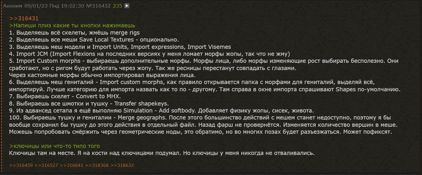>>327390 >какие плюсы так задрачиваться? Во-первых, это занимает ничтожное количество времени по сравнению с остальной хуйнёй, во-вторых, ты получаешь готовый риг, на который можно накатывать кучу выражений лиц с даза, позы, все драйвера не месте, колени, локти и всё остальное гнётся правильно, а не выгибается в ебучих углах как у всех остальных, ну и до импорта, ещё в дазе, ты можешь быстро модифицировать тушку как хочешь. Хочешь делаешь мускулистую доминантку с хуем, хочешь - невинную лолю.