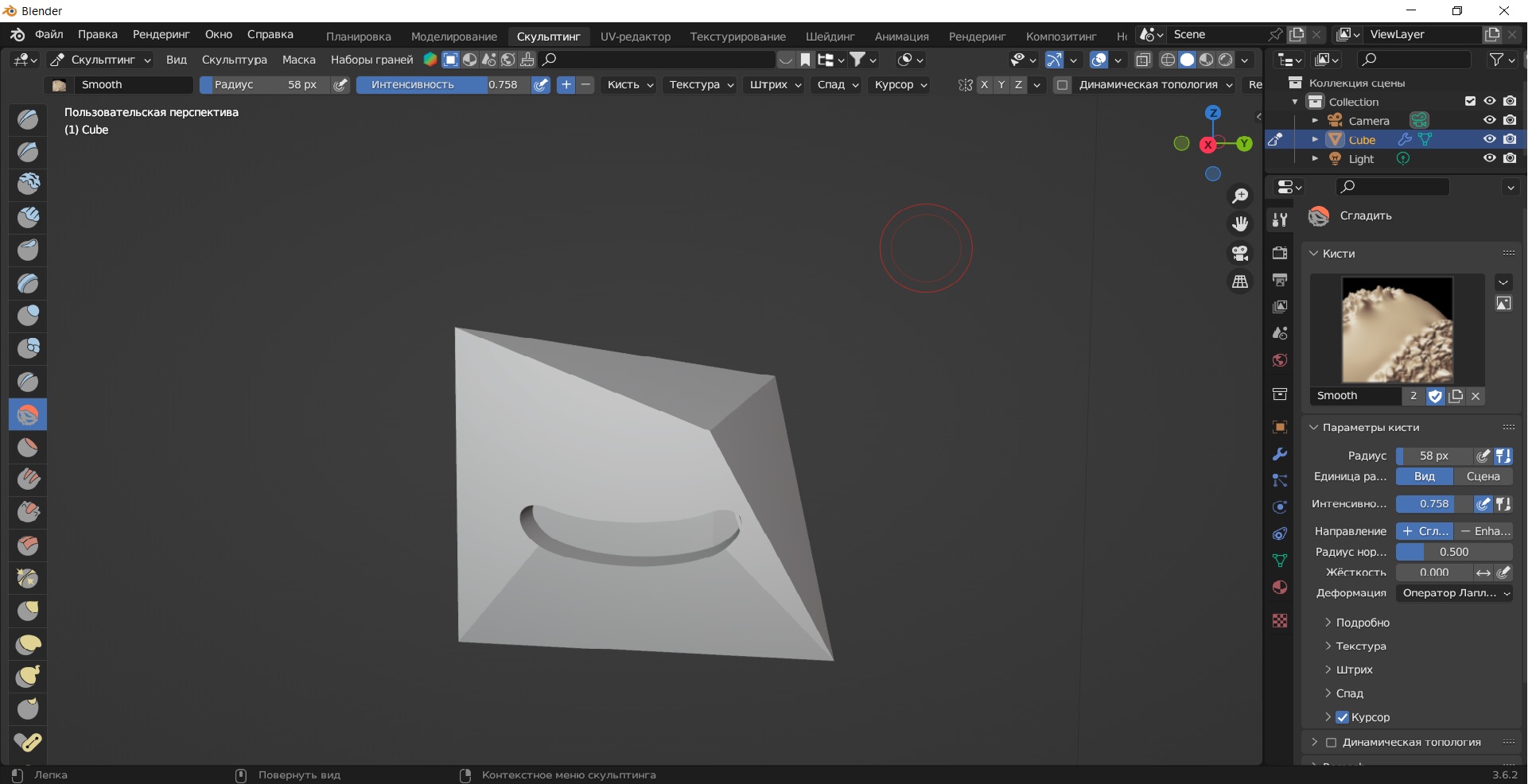 Народ помогите. Делаю спанчбоба. Сделал в моделировании куб и в нём рот Тоже из куба(bool tool) фаской итд. Потом перешёл в скульптинг(количество полигонов увеличивал. Пупырышки сделаю потом. ) Пытаюсь кистью смуф сгладить все острые углы, почему то получается это