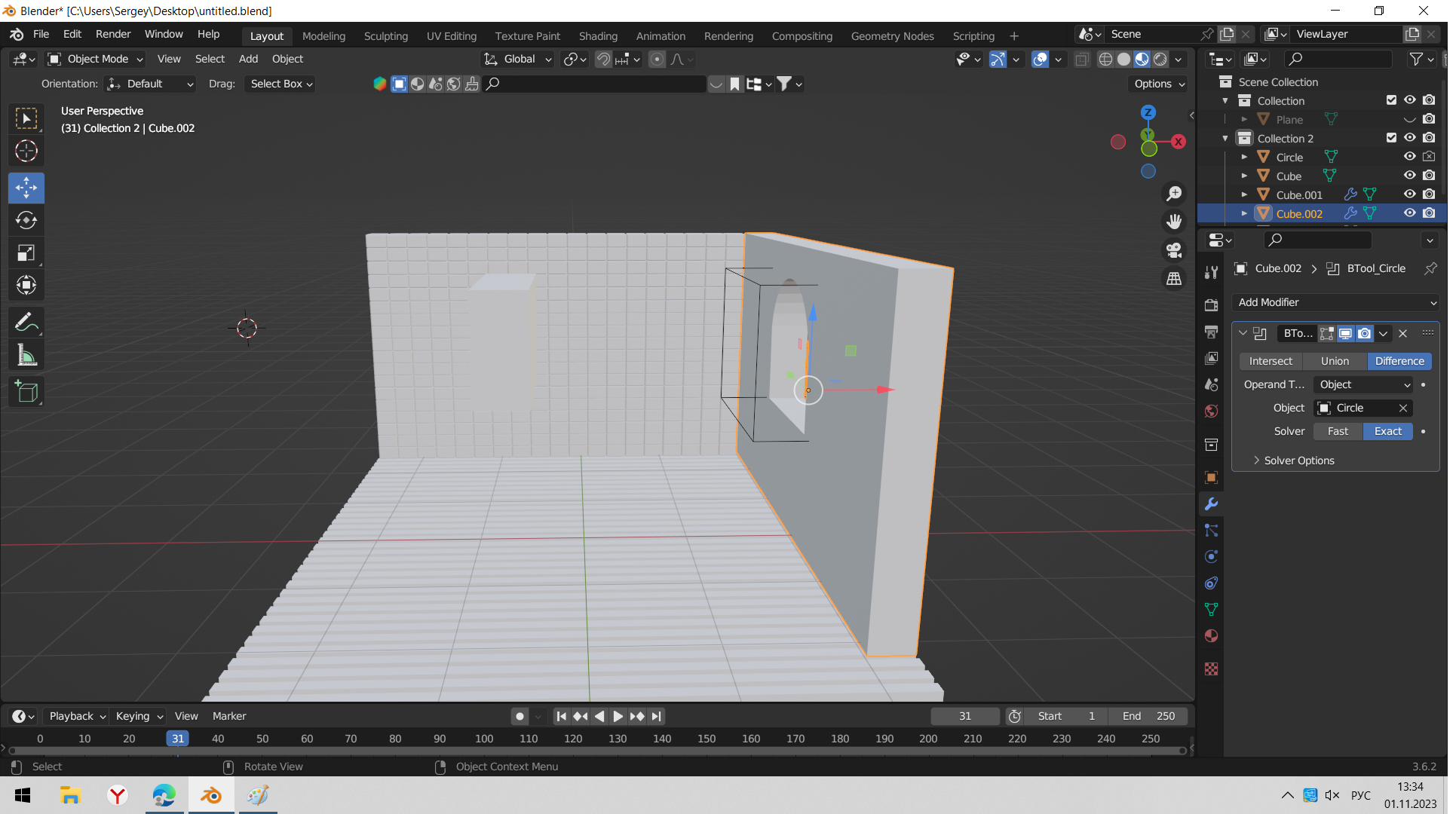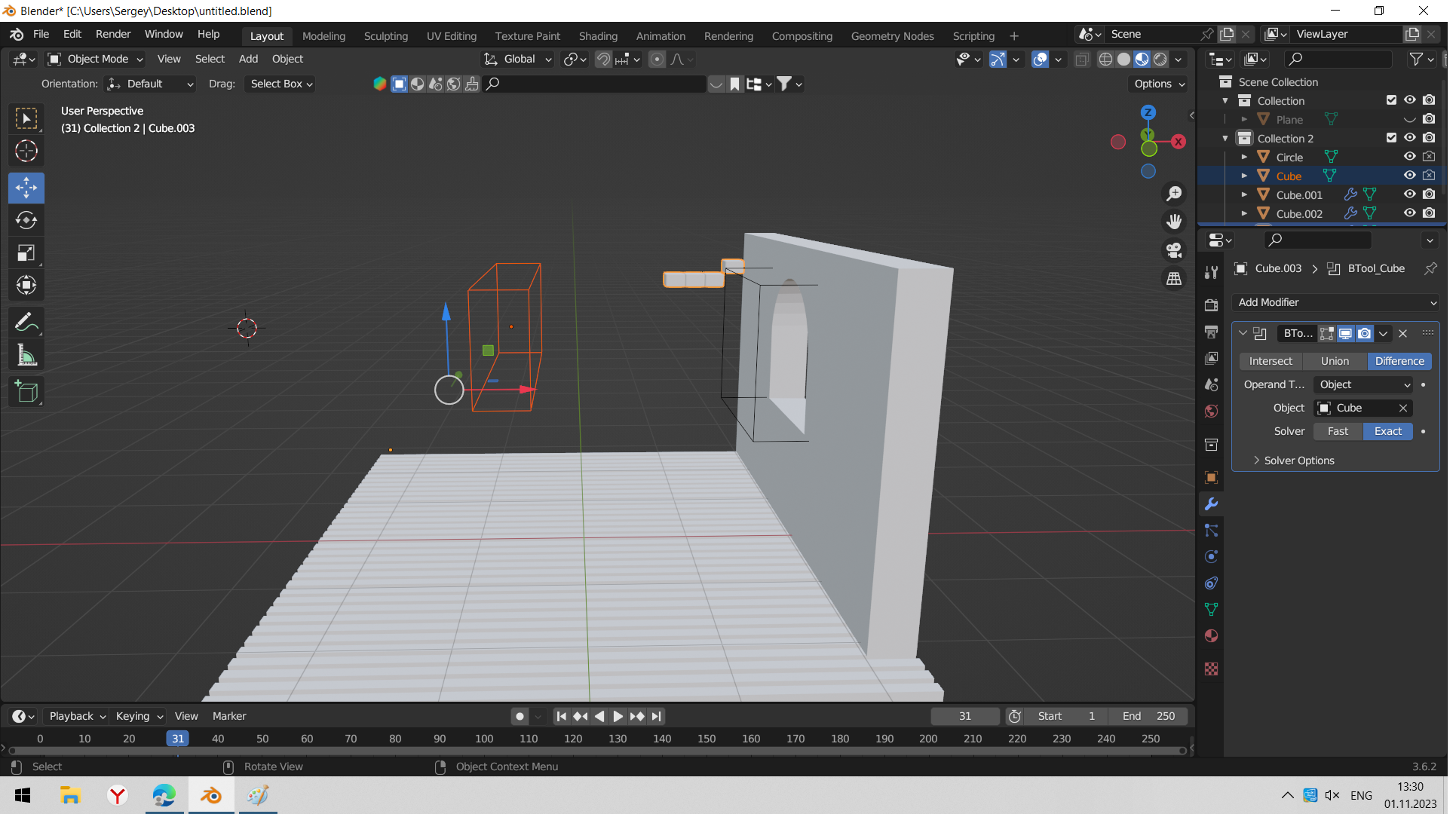 >>327604 Возьми один кирпич и модификаторами array сделай из него стену. Потом примени модификаторы, потом пробуй булять снова. А вообще лучше не булять, а сделать нормальную раму и окно.
