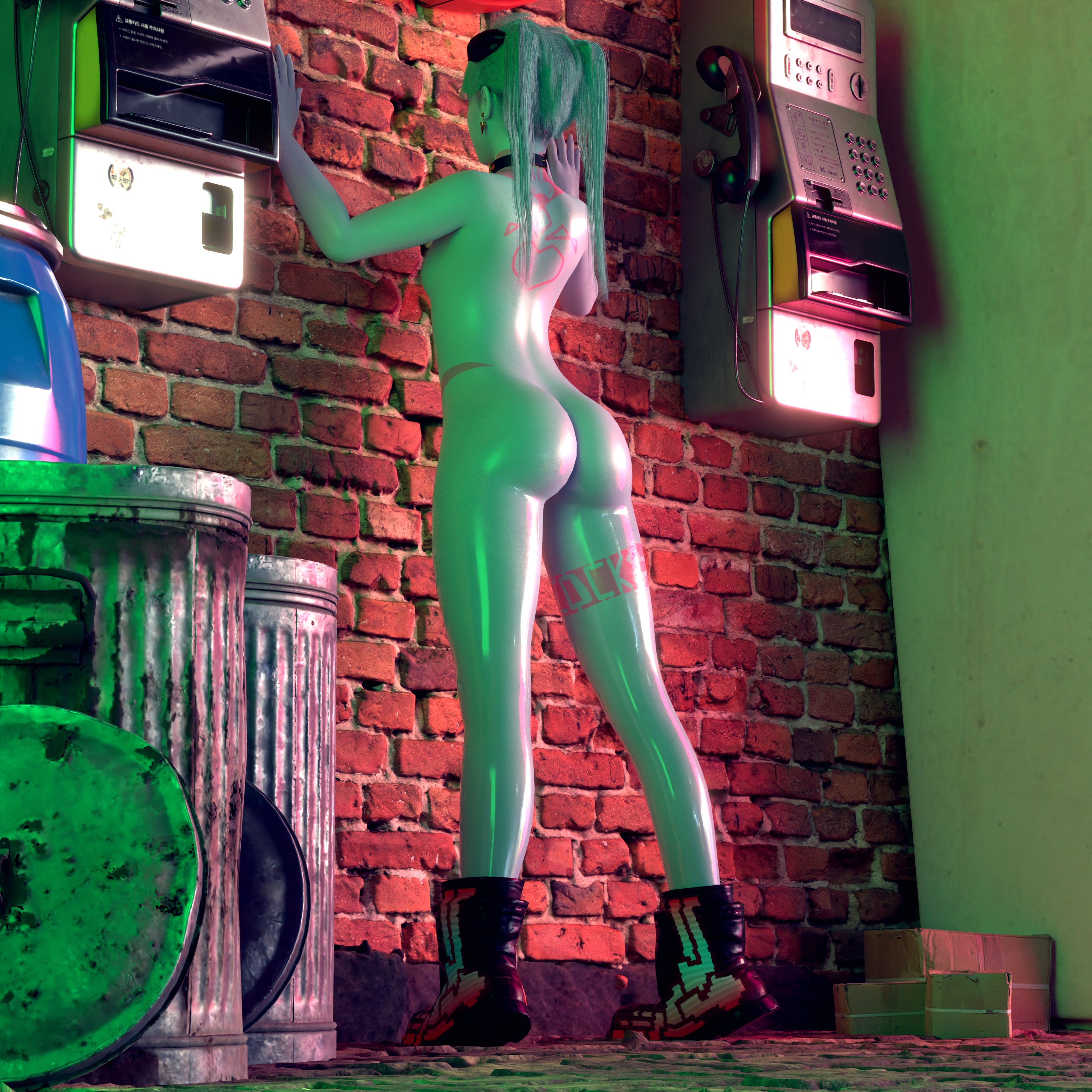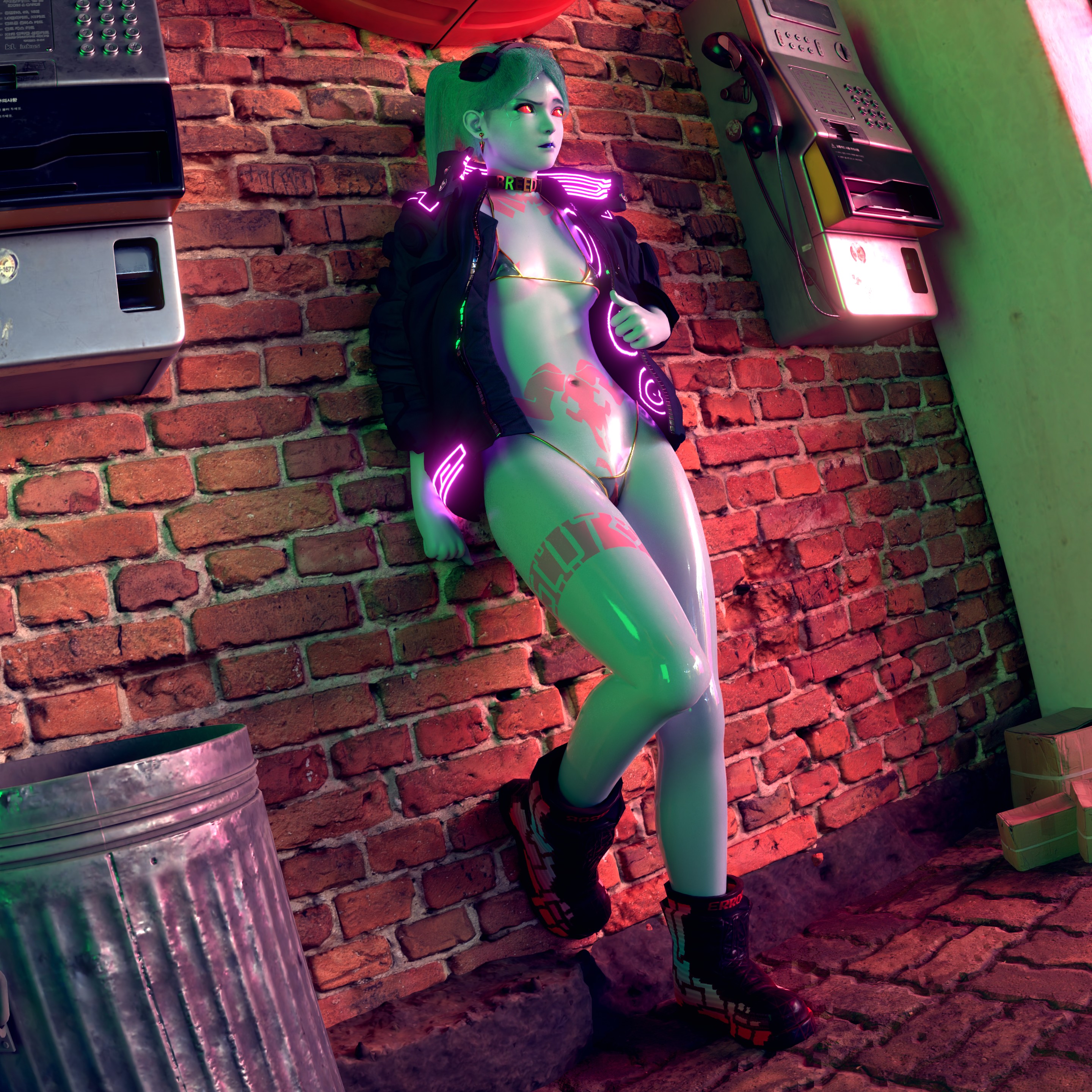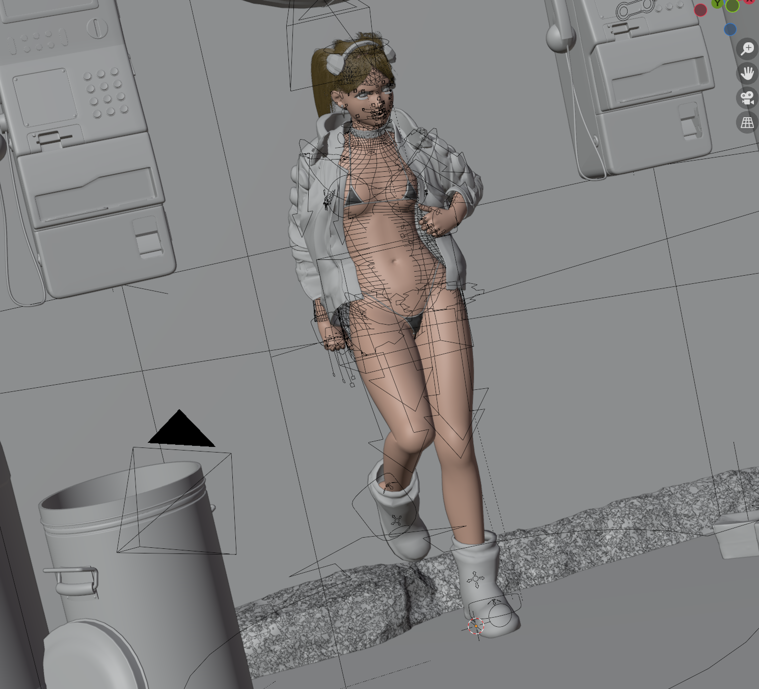 А так тебе дали годный совет, вся сцена выглядит плохо. Слишком детализированные автоматы и стена, которая прям на фоне этой куклы выделяется. А должно быть наоборот. Это уж если не вдаваться в подробности анатомии этого существа. Поэтому все и обсуждают пиздатые автоматы. Сделай их по детализации такими же как урна, сцена станет лучше. И свет надо переделывать полностью.