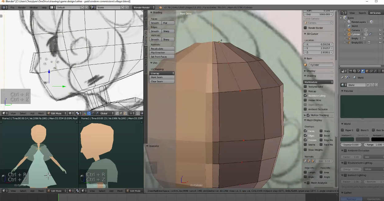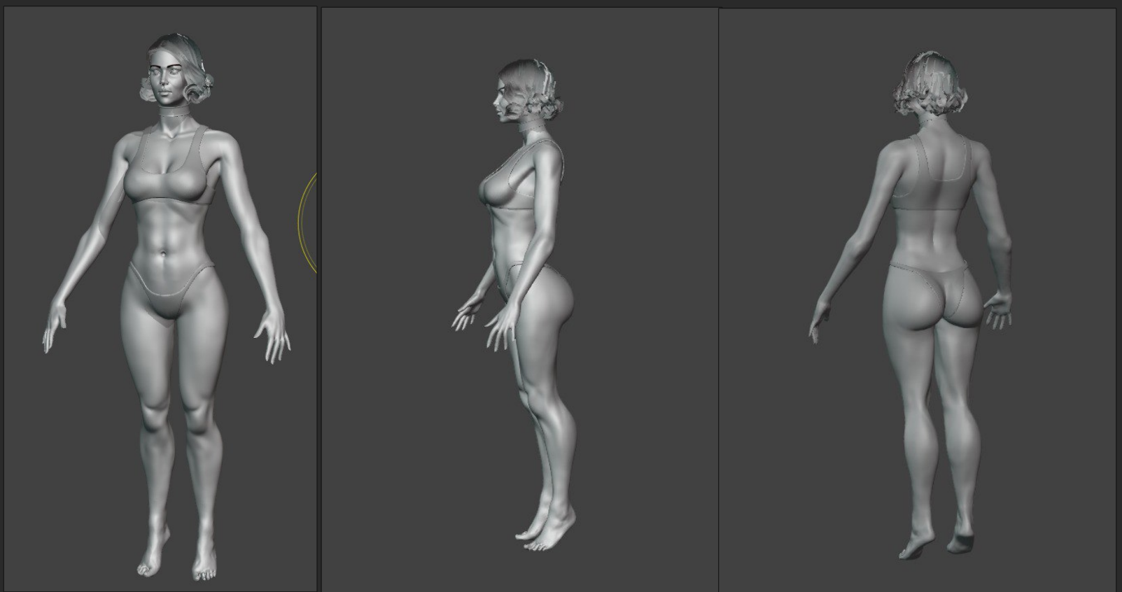 Заебался делать дикарку. Решил сделать новую тяночку без включенной симметрии, вот что налепил за пару часов. Сделаю ей прическу лоу-поли и потом сделаю по той же схеме для дикарки. И кости, и скиннинг, и все остальное попробую на этой простой модели и потом перенесу на навороченную.