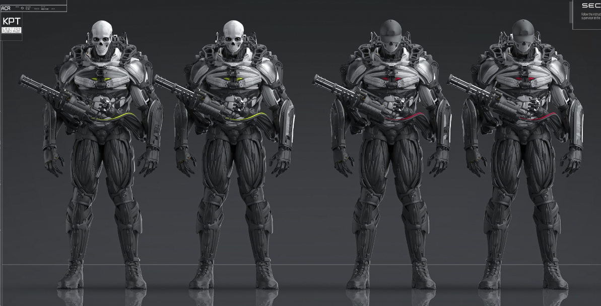 Тебе же проще взять палитру от реликтера - цвета основы и вставок, затенения, граней, грязи, узоров/трещин на материале и перекинуть их на космонавта (а если в SP красишь, то просто умный материал создай и через него всех персов в проекте крась), а потом просто оттенки на нужные тебе поменять. Тогда и лучше выглядеть станет, и однотипно в хорошем смысле.