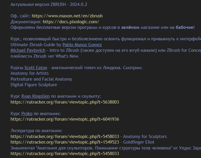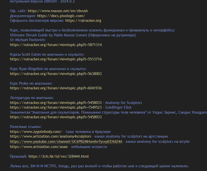 >>336089 >Материалы Иногда в уроках по зебре валяются >цгперсии Ну так есть же сайт, где ты со скоростью 150кб\сек выкачиваешь файлы по порядку потом распаковываешь: https://cgpersia.com/?s=zbrush+matcaps Я так как-то раз 8гб скачал там
