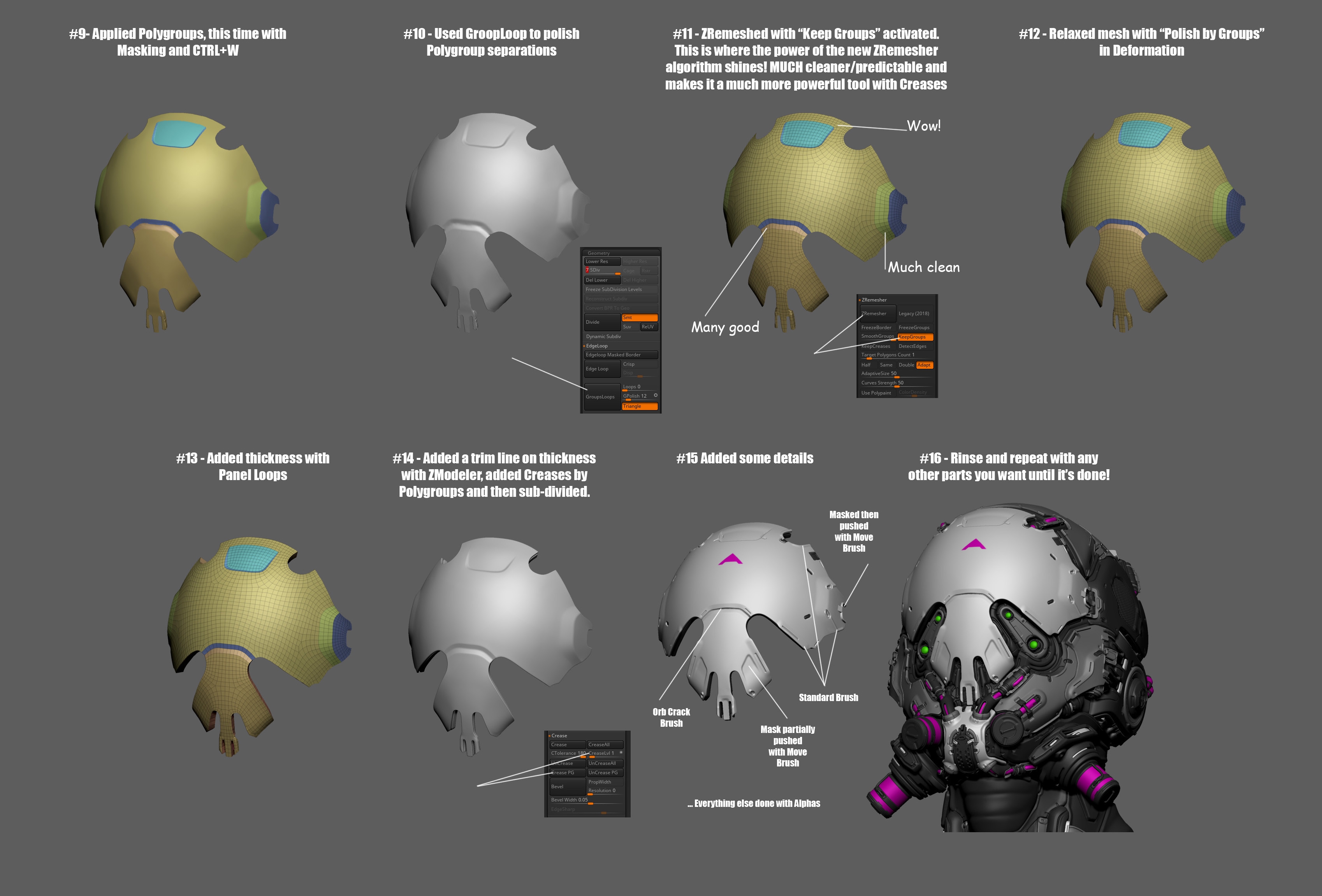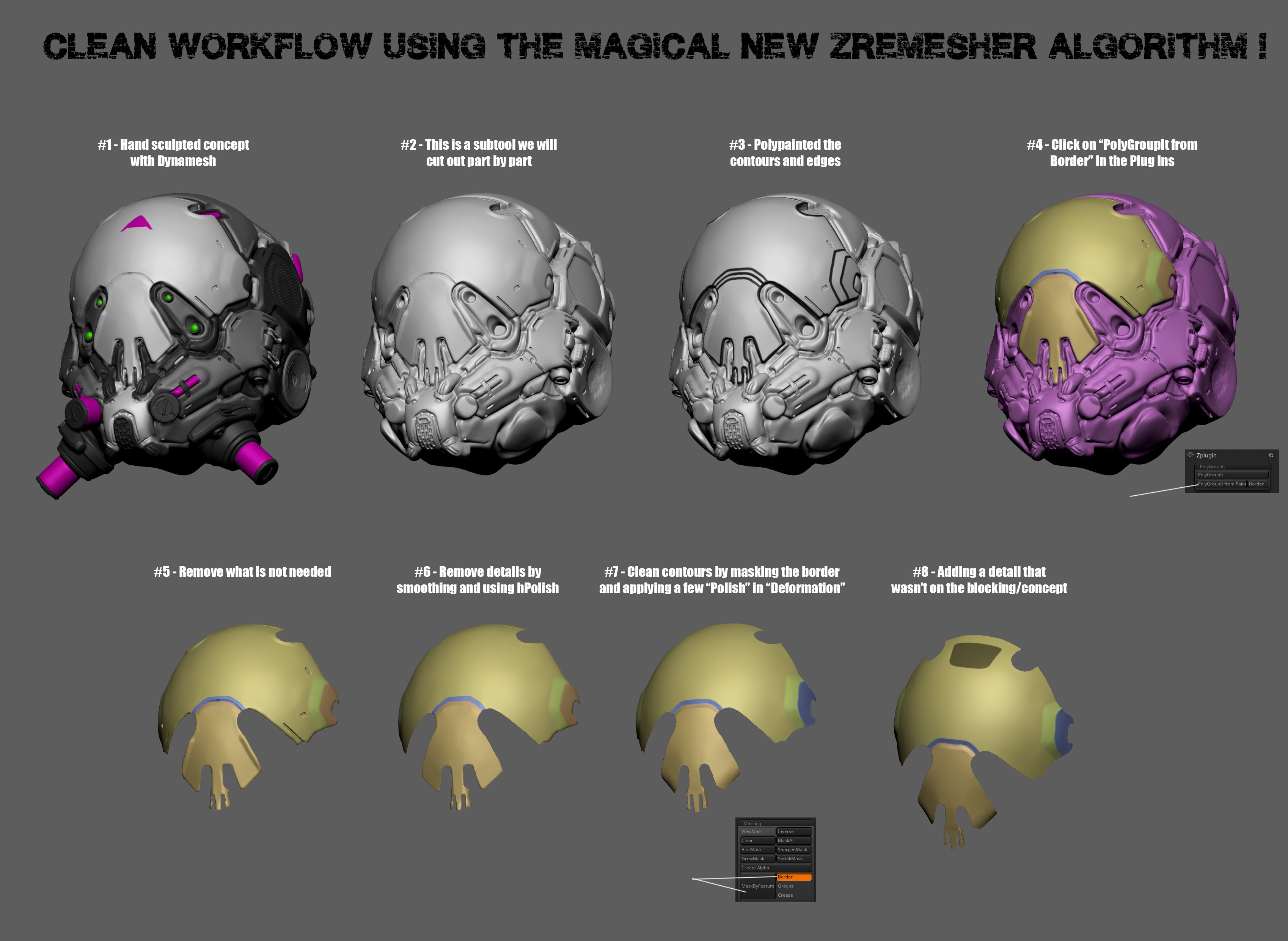 >>335183 Зиремеш и змоделлер. Где-то видел такой метод и сам его применил. Лепишь сложную форму в дайнамеше - выделяешь лицевую полигруппу - удаляешь все кроме нее и зеремешишь ее, а потом змодделером доделываешь. Вот пикрил я баловался с этим вариантов, у тебя можно уже элементы доспеха на твоем пике чистить таким макаром, а потом в нормальной программе для полиганального моделинга сетку приводить к человеческому виду.