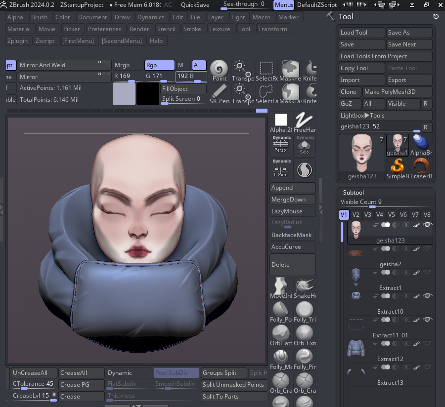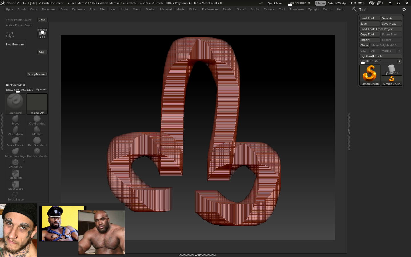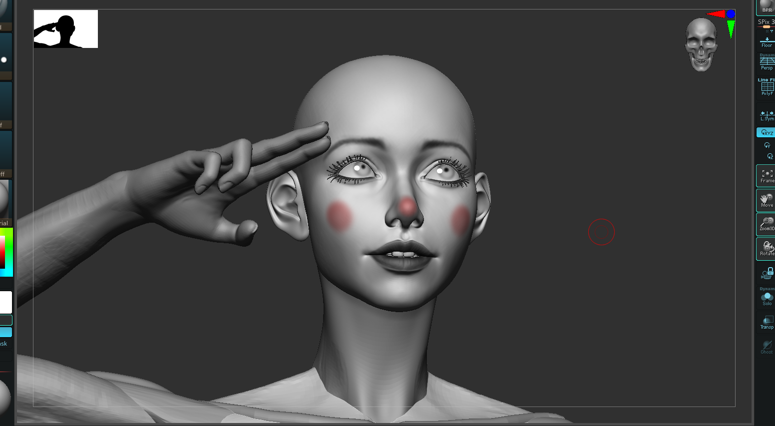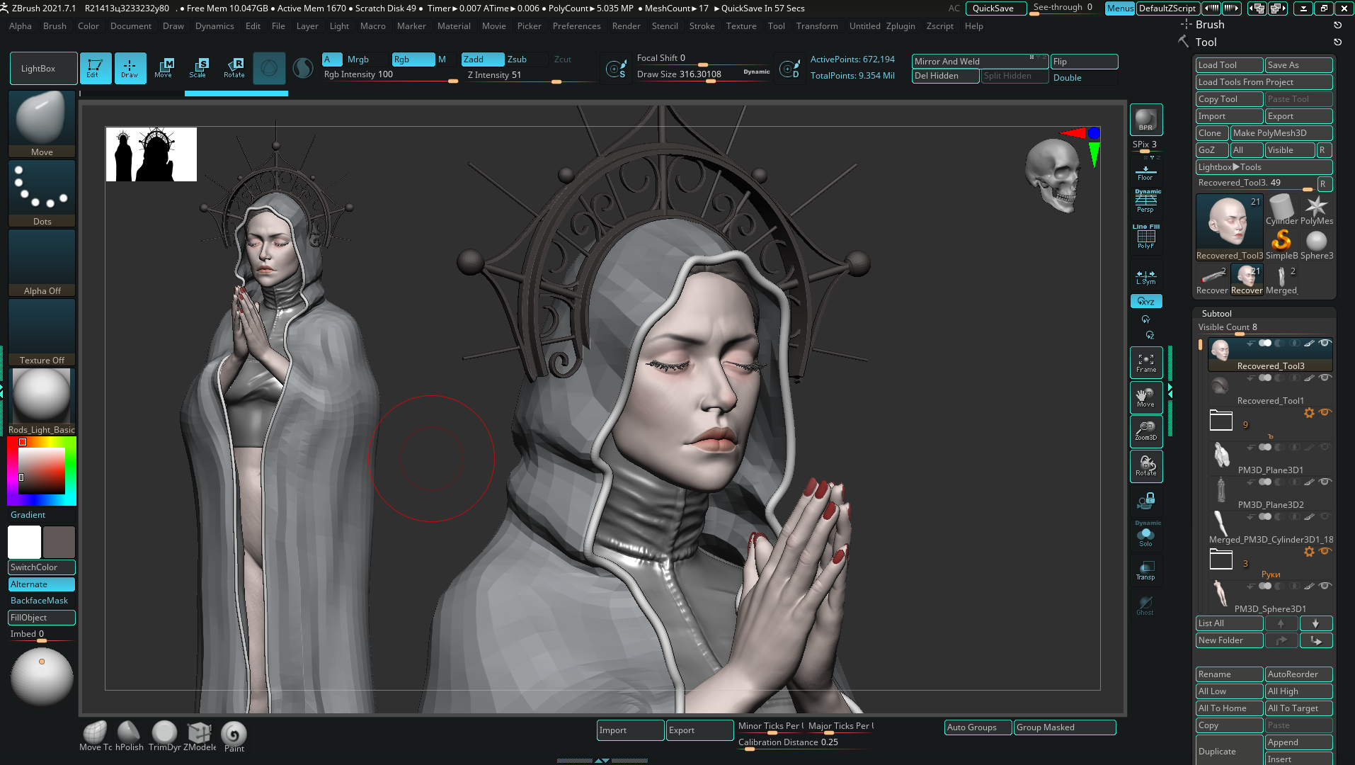 Начал после черепа лепить персонажа по курсу. От лепки тут правда не очень много в отличие от черепа. Больше работы с геометрией для блокаута. Какие-то интересные вещи узнаю, но какие-то даже нагуглить не могу. Например, не могу понять, как удерживать толщину меша. Есть ли способ? А то едва провёл смуфом, меш сузился. Туда-сюда с инфлейтом гонять чёт ну такое. Также я пока не представляю что делать с лицом. Дали какой-то дефолтный женский меш. Чувствую, я его лишь испорчу своими мазками. Но хули терять с другой стороны.