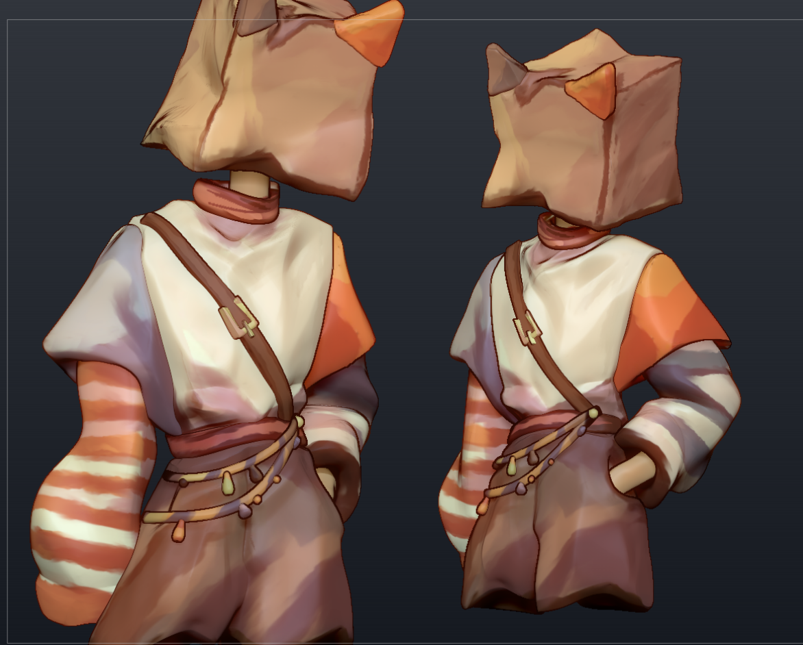 Пилю тут модельку для игры (текстуры пока временные набросал, развертка там тоже уг) и встало два вопроса, вдруг кто знает: 1) на одежде планирую сделать два вида фактуры, как на первом скрине: где 1- косые линии, где 2- вертикальные. И мне надо чтобы фактура была видна не всегда, а по принципу как втором скрине: только в тени. Не знает никто как такую фактуру настроить, делается ли это в блендере или уже в анриле и через текстуру или можно как- то программными методами? 2) Как вам по полигонам? Не маловато?