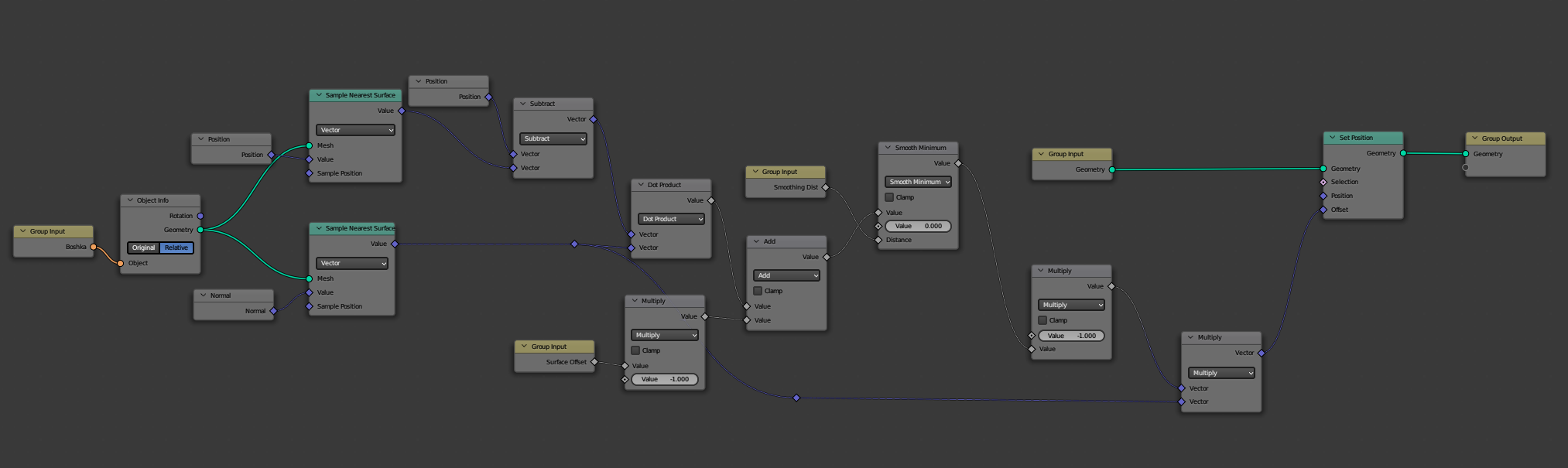 python Mesh → Mesh to SDF → Compare Distances (vs головы) → Set Position для смещения вершин Настройка: