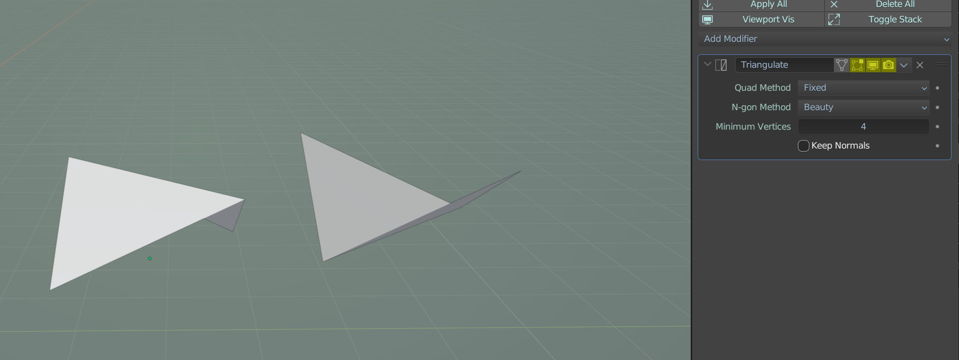>>345985 Не нужно. Максимум что есть смысл сделать — повесить модификатор триангуляции и при экспорте выбрать «применять модификаторы». Но чаще всего экспортёр в конкретный формат движка триангулирует.