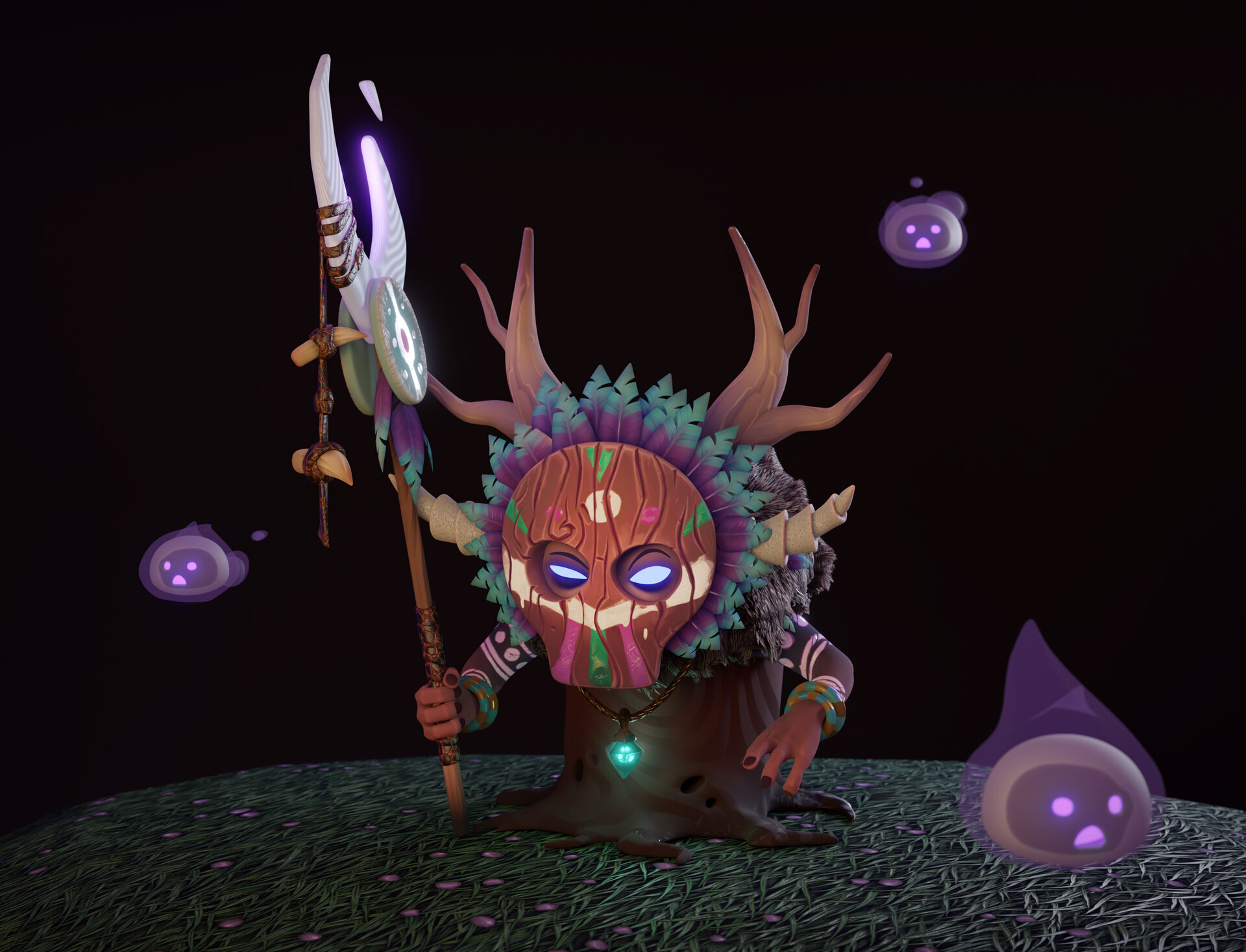 В итоге первое, что было сделано — коллаж из нейросрани, определились какие будут руки, ступни, глаза, рот, нос (с какой из генераций что брать). Как вообще должны втыкаться конечности в персонажа, чтобы он потом мог полноценно двигаться и ходить (посоветовались с аниматором). Потом эскиз поверх всего. Потом нормальное 3д. (снова консультация с аниматором, где добавить топологии для движения и шейпкеев).