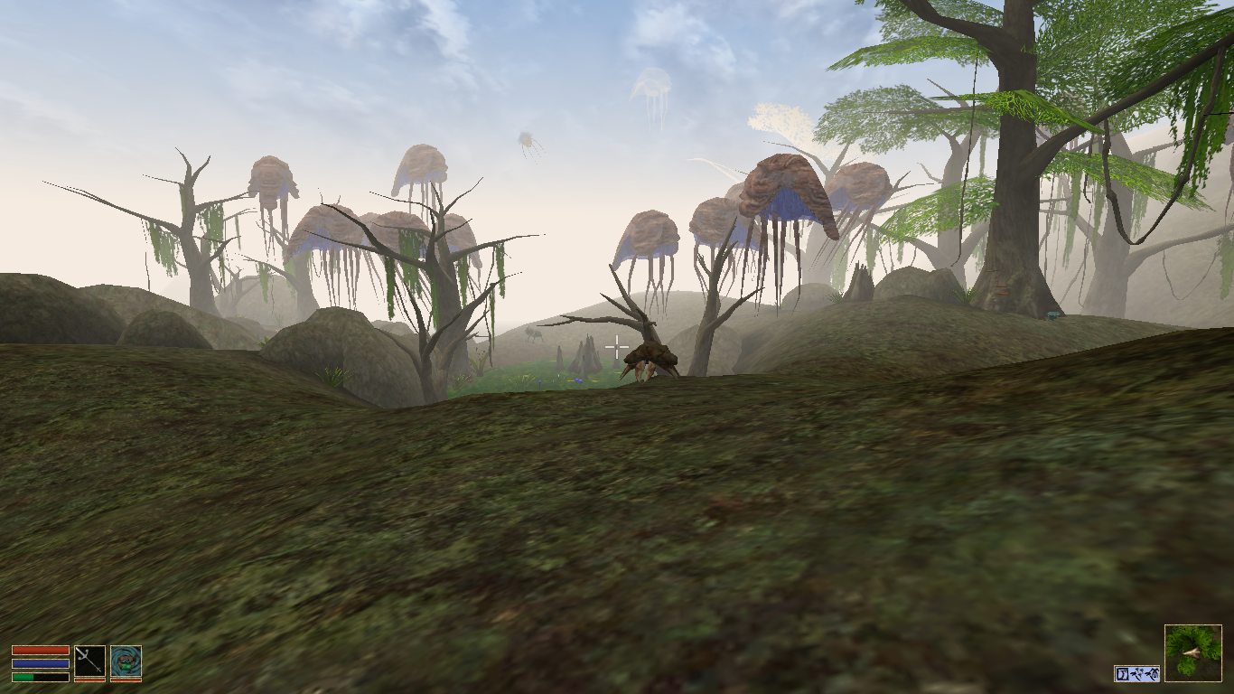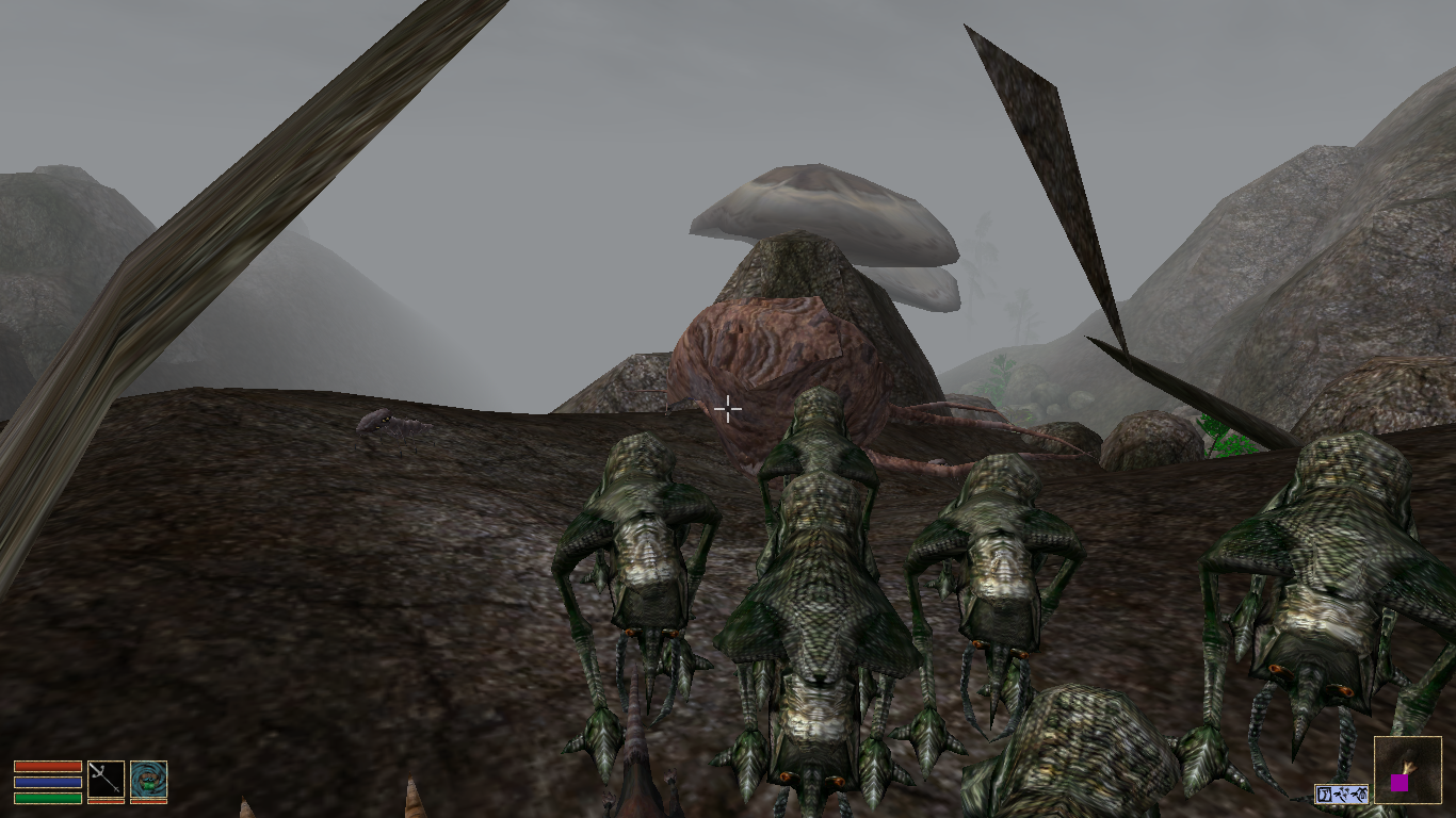 Решил я значит опробовать OpenMW, создал себе нигру, решил поначалу облутать южную часть Горького берега да поднять с пяток уровней. Разумеется, активно изводил живность неподалёку от Сейда-Нина, используя для прокачки оружейных и доспешных навыков. Зверьё, разумеется, быстро появлялось вновь, однако как-то его стало многовато. Особенно напрягало самопроизвольно возникшее пастбище нетчей (см. рис. 1): рукопашным оружием до них хрен дотянешься, а качать лук в мои планы не входило. Причём со временем нетчей развелось столько, что они видимо полностью заблокировали спавн кого бы то ни было ещё. А в оригинале, как я прекрасно помню, такой excited не было, никакого перенаселения на локациях не возникало. Не маячил один и тот же случайно заспавнившийся моб в одной и той же точке неделями (см. рис. 2) Совсем цирковой масштаб это приобрело, когда проходя к югу от Балморы услыхал звуки затвердевшие животные, решил заглянуть под текстуры, а там целый зверинец (см. рис. 3).