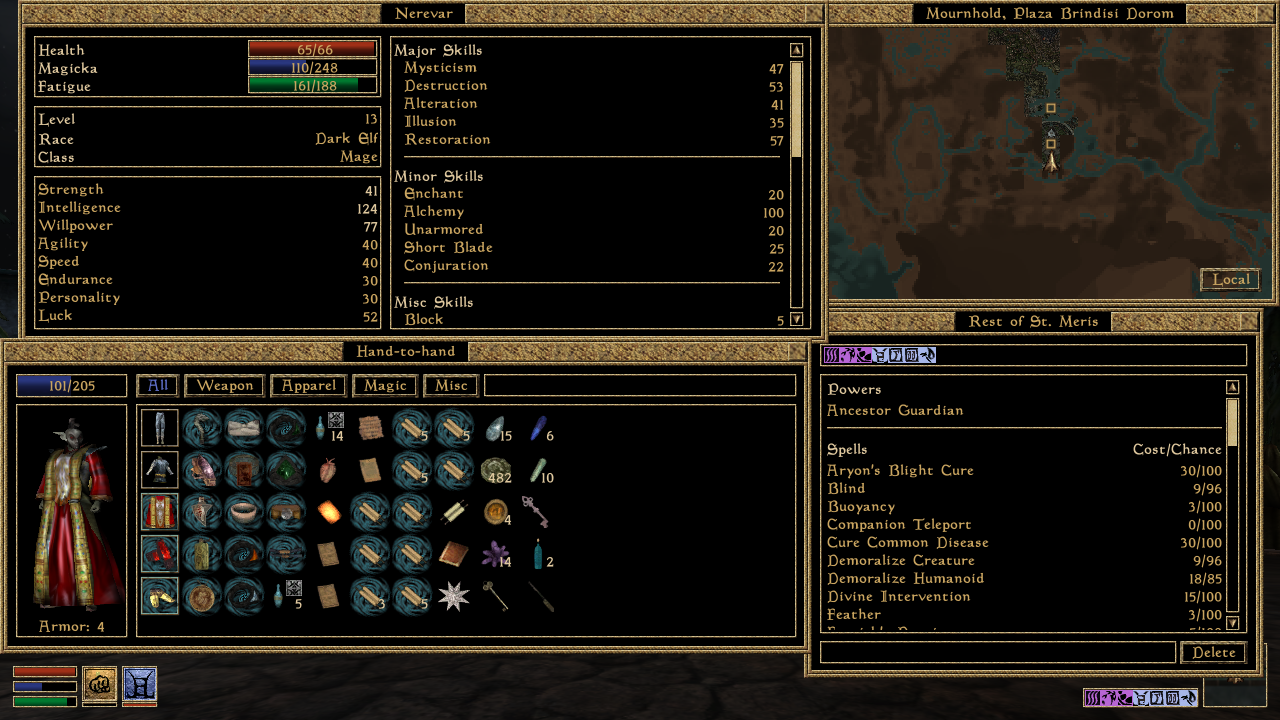 У меня в игре странный то ли баг то ли фича, не пойму. Короче, я нигде не могу найти заклинание отпирания замков! ЧЗНХ? НА сайте ElderScriolls fandom написано, что это заклинание есть у Сирилонве и Марайна Дрена из Вивекской и Балморской гильдий магов соответственно, но у них нет этого сраного заклинания! Ситуация осложняется тем, что мой персонаж имеет класс Акробат, а у него нет навыка Безопасности, зато есть Изменение. Т.е. я по идее должен ломать замки заклинанием и качать навык, но приходится использовать свитки Ондузи. Дичь какая-то. Геймплейных плагинов никаких не устанавливал, только графические. Не знаю, мб. это Morrowind code pach?