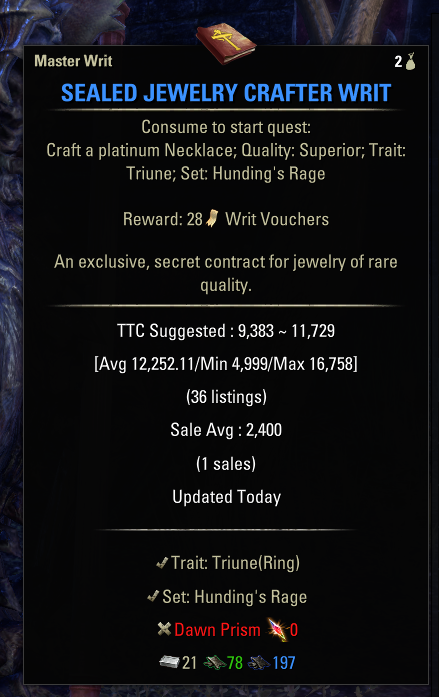 >>1971196 Да excited вышла. Я через мастер вриты фармлю куски для Signature with Class ачивки из Голд Роада. Ежедневно падает кусок. Вчера нашёл у себя в сундуке четыре заказа на синию бижу с triune трейтом. Пошёл, купил в сиро четыре даунпризмы. Скрафтил на каждый заказ то, что написано в подсказке, которую добавляет аддон. Зосовское описание заказа я уже давно не читаю. У меня уже был активен заказ на фиол бижу, который я сдал сегодня, так что крафтил по подсказке, а не квесту. Смотрю, на заказе метка не появлятся, что для неё уже есть предмет. Думаю, может баг какой, решил оставить на сегодня проверить. Проверил, блядь. Фиол бижу сдал, открыл один из этих синих заказов - квест пишет "надо скрафтить". И тут у меня глаз упал на описание квеста - посмотрел что я скрафтил. Начал вчитываться, что в описании других заказов. И тут меня накрыло...