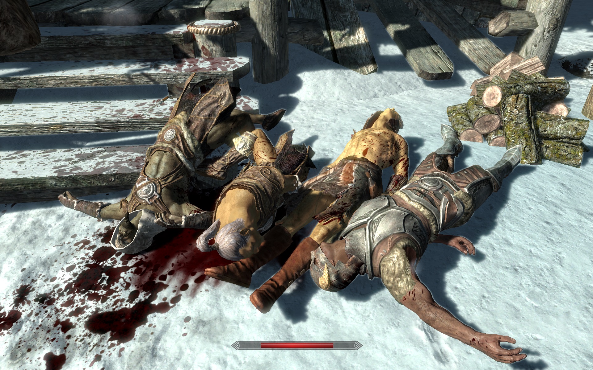 Т.е. бандосы в среднем на 10 уровней выше меня. В большинстве случаев это бы не было проблемой, но ведь они всегда идут стаками в 2-4 человека. Стоишь с щитом в блоке против одного, как тебя обошел другой или вообще стрела прилетела.
