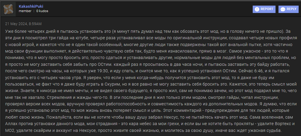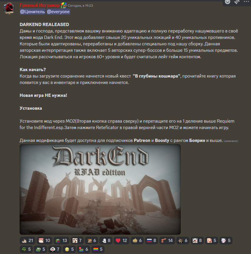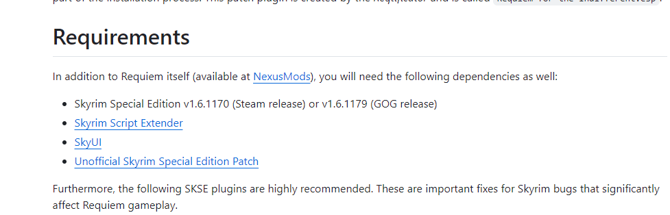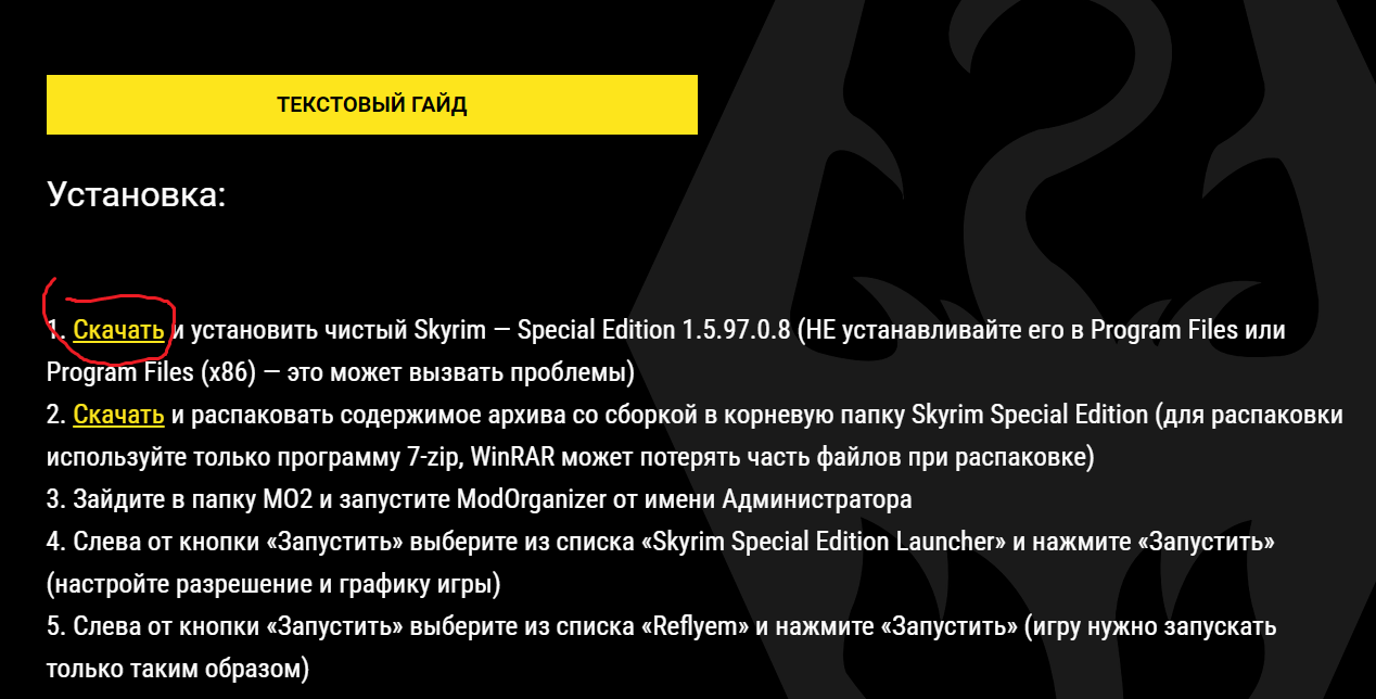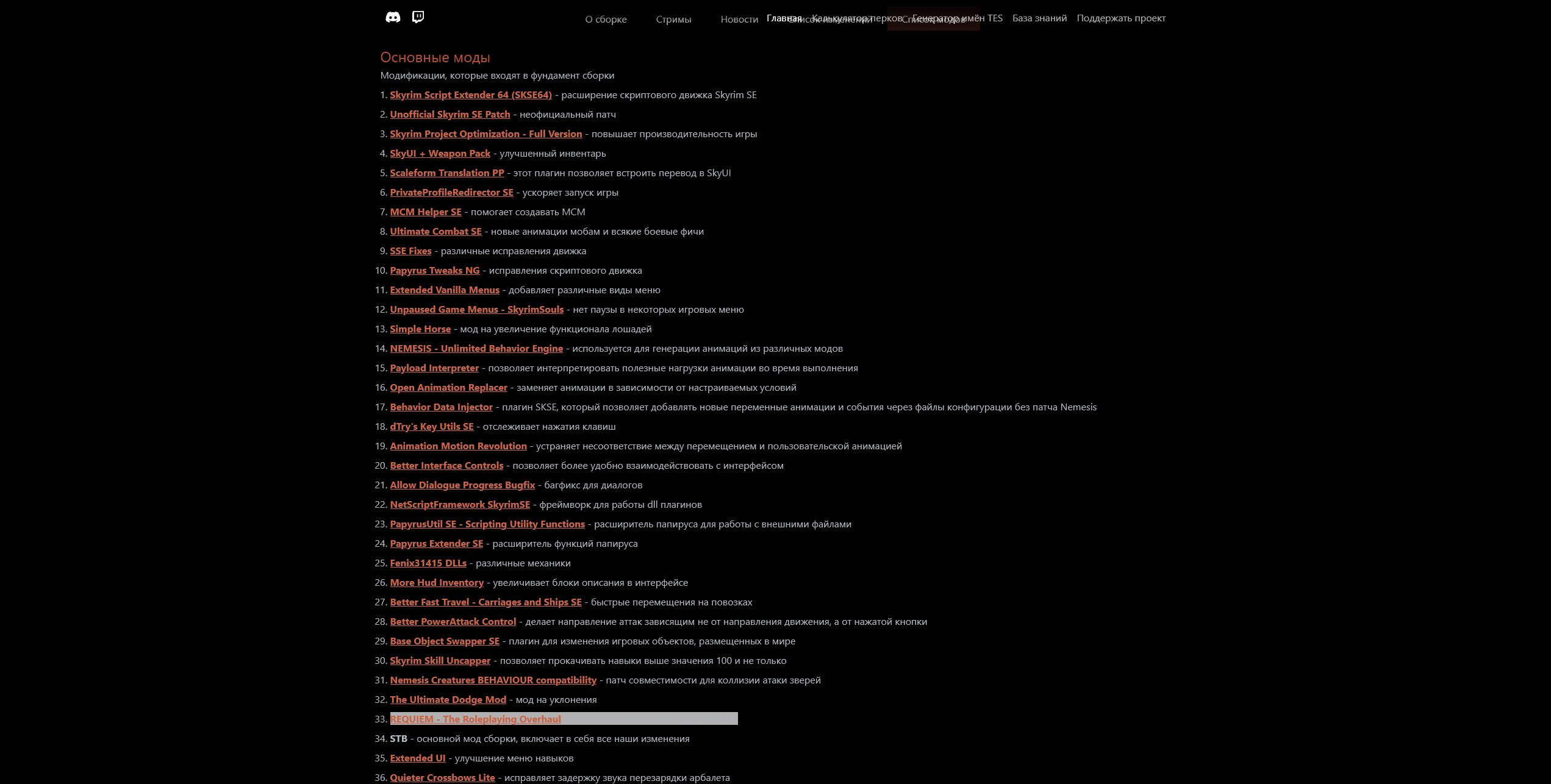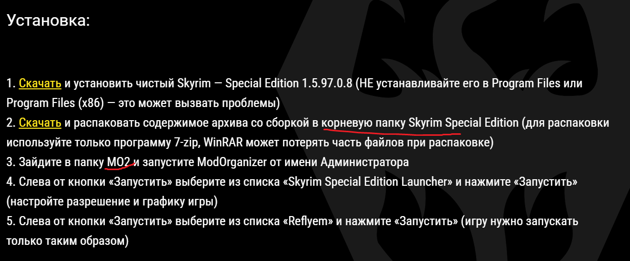https://disk.yandex.ru/d/9w0WT_qE8jnSlg - Васяносборка местного анона, представляющая собой Mod Organizer с модами и плагинами, и установочные файлы SKSE. Основа - Реквием 2.0.2, но продолжает развиваться параллельно 5.х.х Реквиему. Сборка полностью настраиваема. Требует чистую русскую Legendary версию Скайрима (можно не устанавливать HD-паки, есть производительный пресет без графономодов, можно ставить на английскую озвучку). Подробное описание сборки: https://disk.yandex.ru/i/y7gv_6XeoSU8fA (Обновлена 24.06.2022)