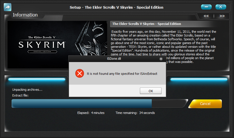 Скачивал скайрим по этой ссылке. Во время установки выдало такую ошибку. Нажал ОК и установка откатилась на исходную. Ставил не в program files. Что это значит?