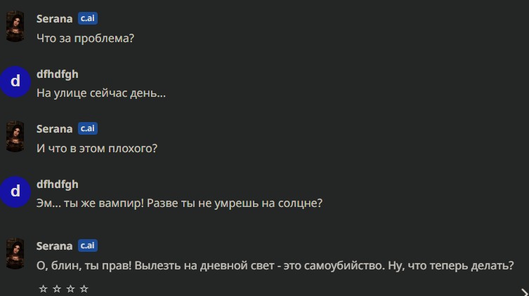 Почему Беседка не стала показывать вампирскую натуру Сераны, почему она не сосёт кровь спящих как ГГ по ночам, почему её не тянет на кровь в бою, она не прокусывает шеи врагов не обращается в вампира лорда, не чувствует голод, а только прячет лицо от солнца под капюшоном но выставляет свои сиськи под его лучи? Ей даже консервы Валерики не нужны, хотя было бы логично что у неё должны быть вампирские потребности.