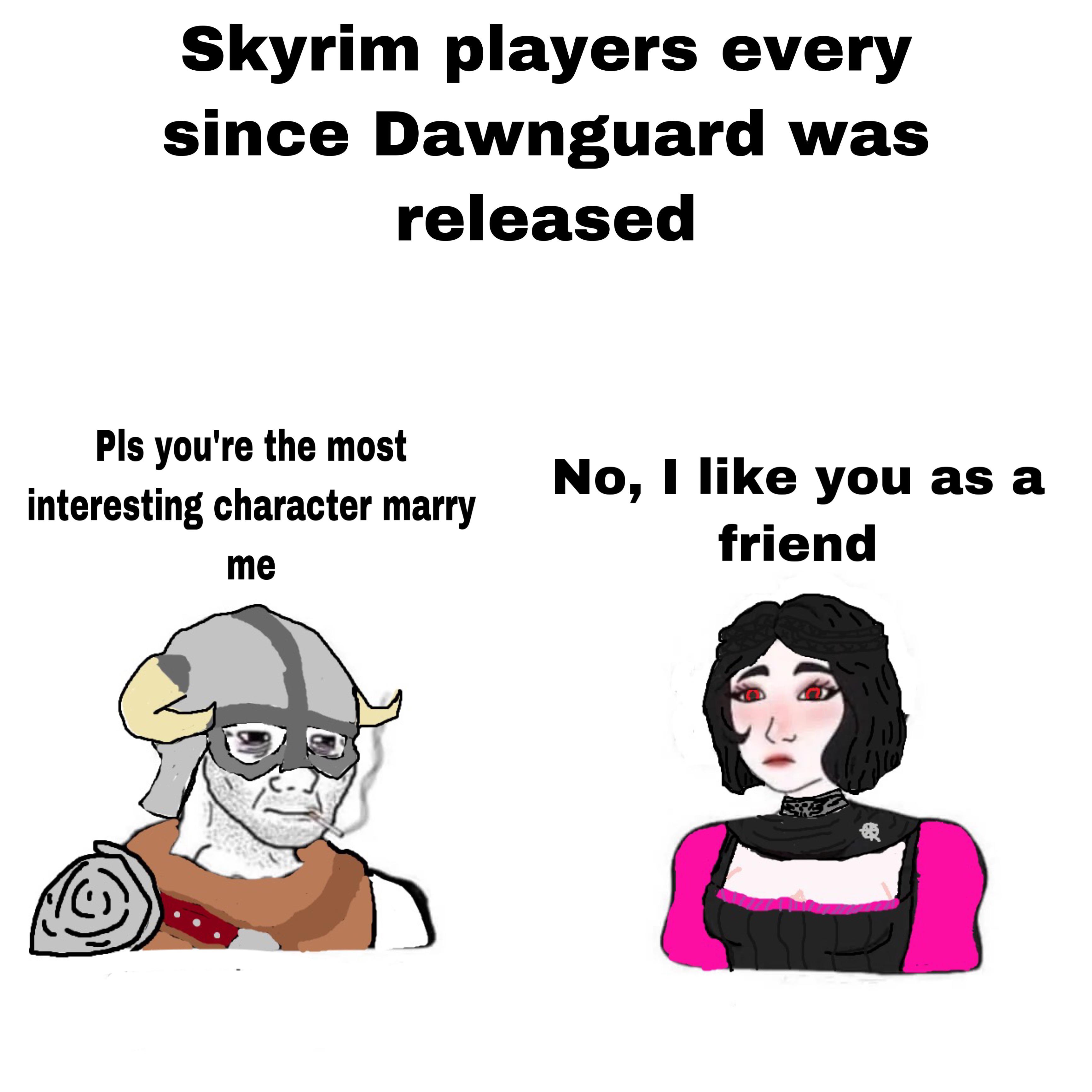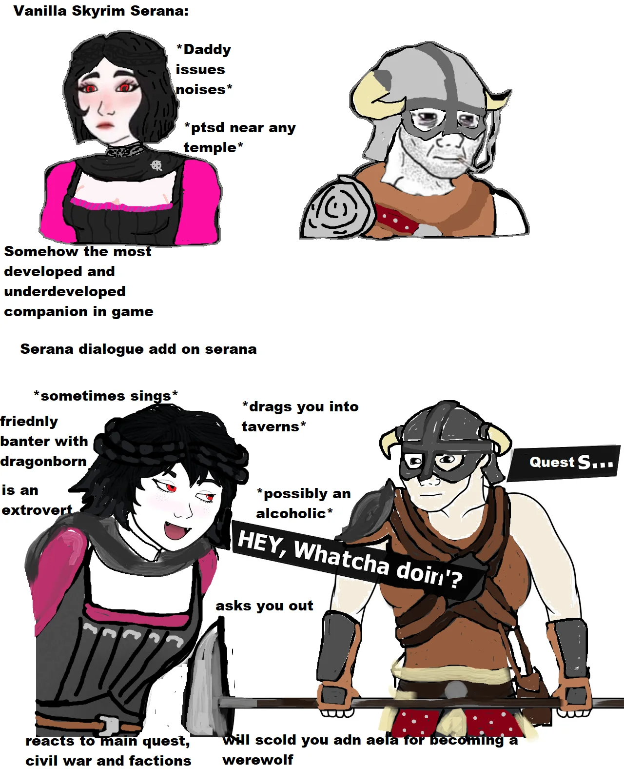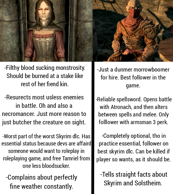 >Довакин идёт в стражу рассвета за тем же, зачем в любой движ - за деньгами, за сражениями, за новой броней, да и в целом посмотреть, что там за ребята собираются. Тебе все трындят про вампирскую угрозу, вампиры набигают на города по ночам, вампиры устаивают засады на дорогах, вампиры жрут стендарритов, герой пошёл бы к охотникам чтобы с этой угрозой разобраться и по сюжетке стражи он это успешно выполняет. >Если Довакин уже вампир на тот момент, ему тем более нужно сходить на разведку, выяснить, насколько всё серьёзно. Отличная идея пойти вампиром на собеседование к охотникам на вампиров, ты сиродилец дохуя? Моварт покусал? >Довакин либо сочувствует вампирам и сам хочет им стать, либо он уже вампир, поэтому он провожает женщину к отцу. И далее по сюжету. Какое может быть сочувствие к кровопийцам уж тем более после всего того что было в скае? А если ГГ и сам вампир то всегда можно пойти к Фалиону. >Если Довакин не вампир и не хочет быть вампиром или если он, например, охотник на вампиров, он должен немедленно убить вампиршу, пока она слаба. Древний свиток изъять, отдать на изучение специалистам. Вот, но Тодд поленился делать альтернативу как и в случае с Соловьями, благо модами допилили. >Если довакин-охотник ссыт убивать женщину Фишка в том что такой строчки диалога вообще нет, а она была бы тут как раз к месту, если ты охотник потому что если ты вампир то ты МОЖЕШЬ сказать Серане что Стража хочет её смерти как одного из отродий, но в ответ Серана скажет что в скором времени Стража убьёт и тебя, почему такого диалога нет в случае если ты охотник? The Dawnguard would want me to kill you. "Don't think that'll keep them from turning on you eventually. They'll figure out what you are." >или чувствует, что ситуация слишком сложна для такого разрешения, Вот это уже другое дело, Охотник послан узнать информацию о важном для вампиров артефакте, а эту информацию можно добыть только из Сераны >он отведет ее к своему хозяину в форт Донгард для заточения и пыток. Иных вариантов нет. И это можно сделать кстати, но уговорить её войти внутрь на этом этапе нельзя Serana: "I don't like the look of this place. I'll wait for you back by the entrance." а вот позже Изран встретит Серану в пыточной. Вопрос почему Охотник вообще должен её уговаривать, почему он её СЛУШАЕТСЯ, даже когда в крипте он попытается избавиться от Сераны, бросить её здесь чтобы например вернуться с подкреплением, Серана ему скажет не так быстро, "You can't get rid of me that easily." а если оставит её ожидать она будет следить за Довакином "If you think I'm going to let you have all the fun, you're crazy. I'll let you lead ahead, but I'll be keeping an eye on you." >вынужденные бегать по поручениям Сераны придумали маняоправдания, что довакин - марионетка в руках древней вампирши, поэтому всё так складывается. Иначе такой сценарий создаёт диссонанс, в итоге у тебя либо лишние стволы в убогих диалогах, либо более интересное очарование, я выбрал очарование. >А негр из Донгарда и его друзья тоже под чарами? Изран вполне мог бы под них попасть во время встречи с Сераной, что же до его друзей то жрец Аркея уже был под воздействием чар, так что это ещё один пример что подобное возможно в ТЕС и я напомню ещё раз что очарование входит в арсенал способностей вампиров, так почему его не может быть и у Сераны? >А если довакин вампир, он может стать трэллом? А можете преодолеть волю Сераны и пойти по своим делам? Да, может пример это Алва находящаяся под чарами Моварта, сама же Алва тоже оч