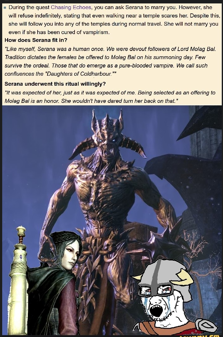 >>1996767 > говорит ESO, где по словам анона, Лол что? Тебе там прямым текстом Лами Бал говорит что Молаг Бал над нею надругался, а мы все знаем как он это сделал по лору. >является полностью каноном TES V: Skyrim в том виде, каком она есть. Ну да, Вивек у нас тоже такой какой он в ТЕС3 по канону, что ещё спизданёшь? У тебя вампирша Волкихар не умеет через лёд проходить, да она даже форму вампира лорда принять не может, очевидная геймплейная недоработка, а не канон, тем более что в ванильном Скае есть Моварт из Бессмертной Крови обративший Альву и дейтсвующий чисто по лору Ордена, ты понимаешь что Виртур и то больший Волкихар чем Серана и её семейка им то как раз клан сменить на Орден надо было.