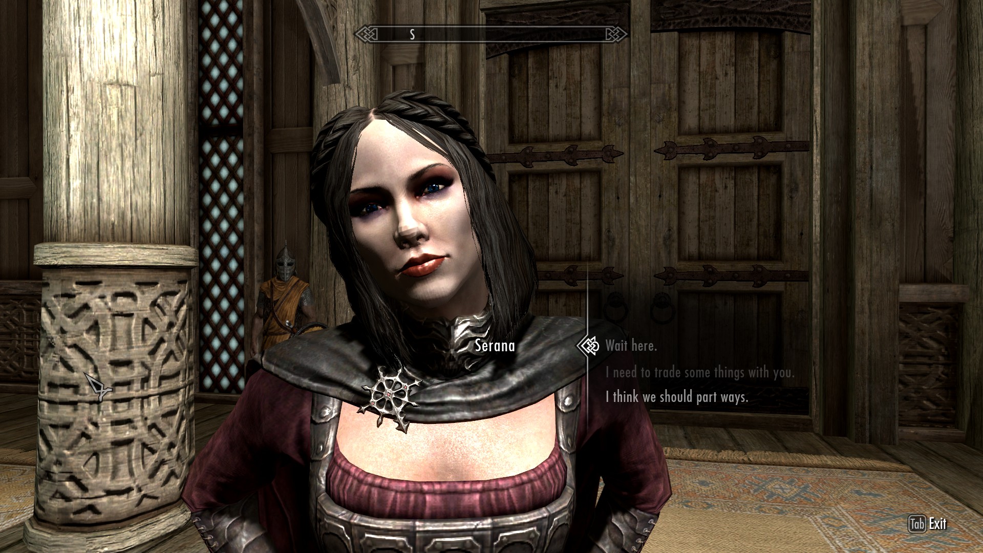 Все гораздо проше. Сценарий писали нормисы для нормисов. Довакин не убил Серану сразу же потому что она милая девушка. Разве это не очевидно, задрот? Это как убить кота. Нормису сразу видно что девушка ХОРОШАЯ, значит надо отвести ее ДОМОЙ. Вот и сказки конец, а кто слушал - молодец.