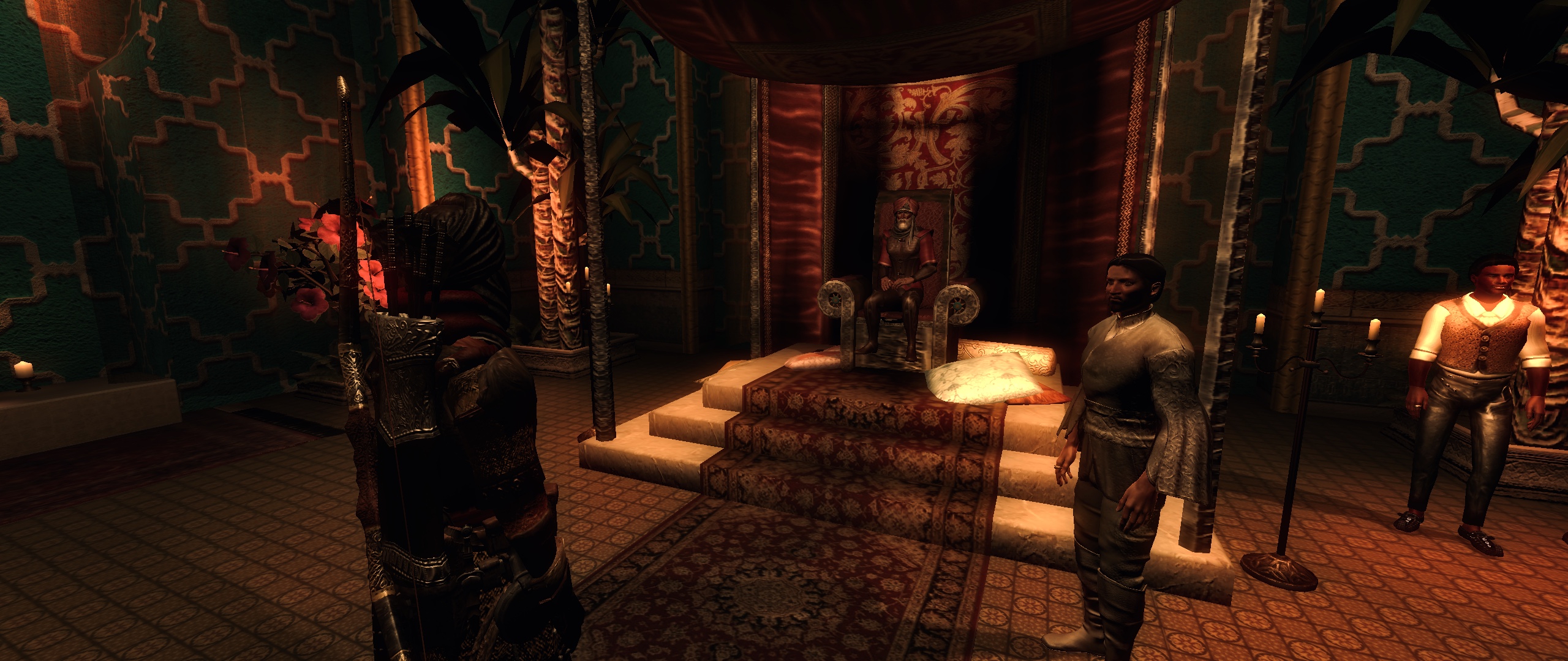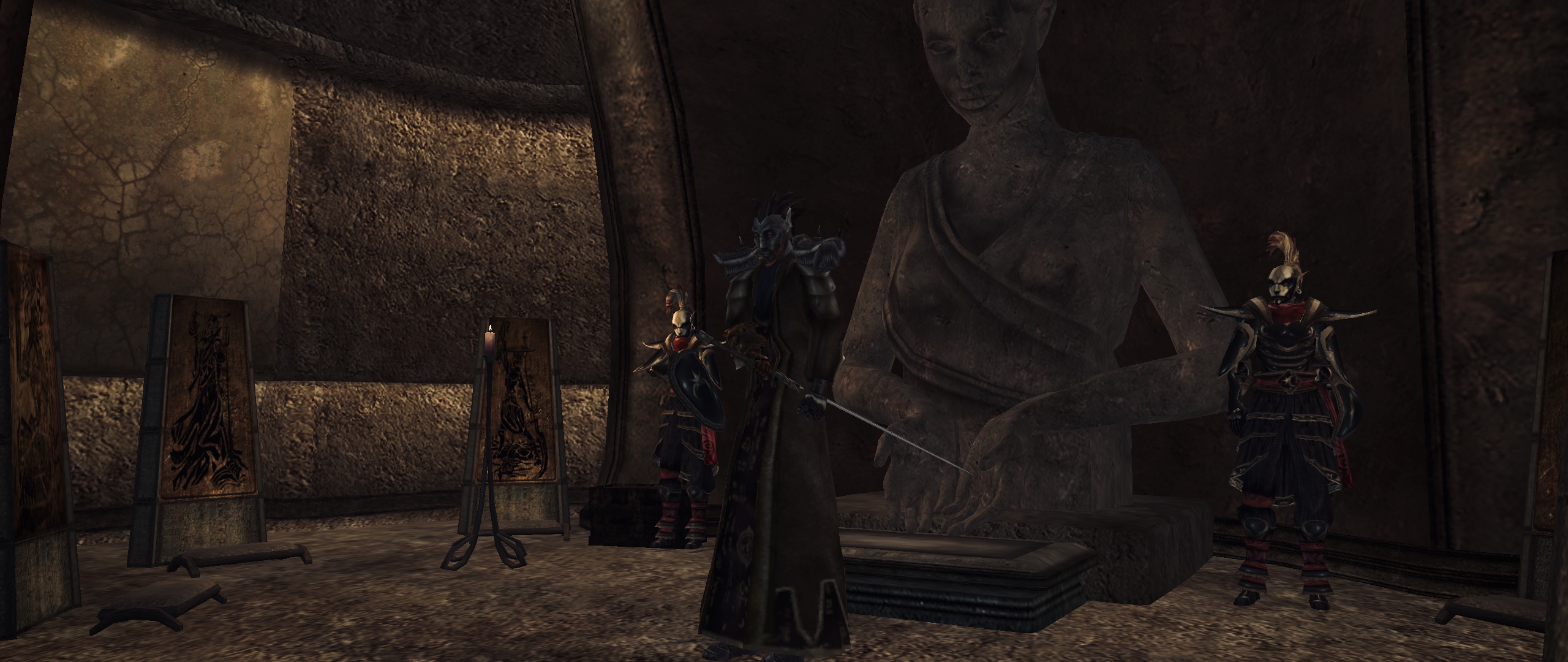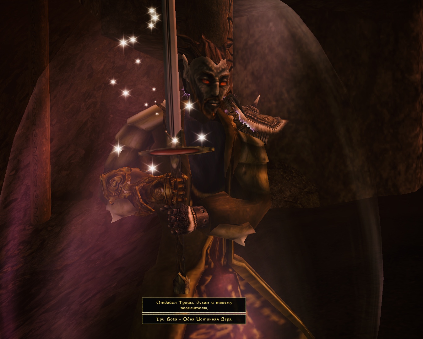 Дальше почилил какое-то время на правах послушного мальчика у редоранских дедов, тренировал солдатиков, а потом взял и решил еще раз перевернуть игру. Вспомнил место из сна, где надо было достать какое-то кольцо, поехал в лагерь Уршилаку и кланялся им в ноги, чтобы приняли (ну надо сказать, по отыгрышу эшлендеров реально уважаю и побаиваюсь, и они в СХ вообще непредсказуемые). Сул Матул на меня взъелся, но шаманка рассказала, как попасть в Пещеру воплощения. Встретился с предыдущими воплощениями Неревара, получил благословение Азуры и ушел, преисполенный волнения и величия. Дальше появляется Вивек и приглашает перетереть к себе во дворец. Вот тут стало стремно.