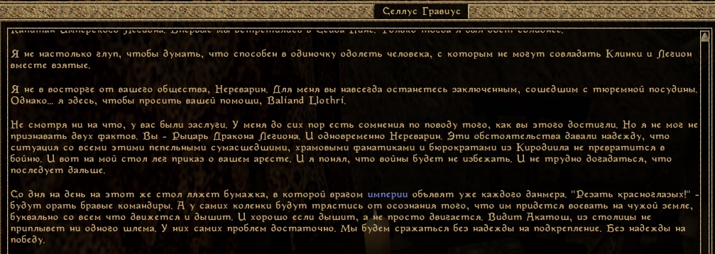 В общем доигрался в миротворца, и дело пошло по серьезной пизде. Гравиус поведал, что начнется резня всех значимых оболдуев, несогласных с Империей и поддерживающих Нереварина, однако далеко не все легионеры хотят принимать участие в масштабном кровопролитии, поэтому Гравиус готов пойти на мятеж и просит помощи Балианда в противостоянии силам Империи. Конечно из-за того, что это васянка, выглядит странно, что такой приказ на зачистку мог отдать Уриэль Септим, зато вполне мог отдать Хелсет. Для него это даже более логично - вместо бомжары-ассасина подбить легион ударить в спину и устранить «мятежного» генерала и его союзников. Балианд на предложение согласился, выхода ведь другого не было, а объявление мятежа на предупреждение отвлечет командование и даст хоть какое-то время на перегруппировку. Само собой, наступление на Красную гору откладывается до неопределенного времени, как бы не пришлось вести армию данмеров отбивать легионерские форты.