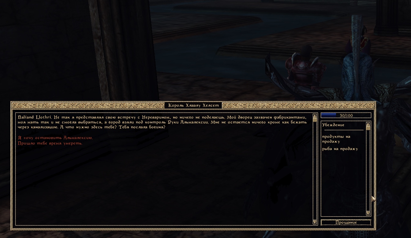 Отправился в его дворец с помощью возврата. Был вариант промолчать или спиздеть, не проверил к чему он ведет, прожал «рассказать все». То есть с этого момента Вивек напрямую втягивается в сюжет Трибунала. Вивек говорит, что про все в курсах, не ссы все схвачено, ща я тебя обратно закину в канализации, дальше проберешься и попиздишься с богиней. Заводной город - мимо, Истинное пламя собираешь через жопу, задним числом после конца квеста. Думал забрать Инструменты Кагренака из Призрачного Предела, но не успел, да и они не особо бы помогли.
