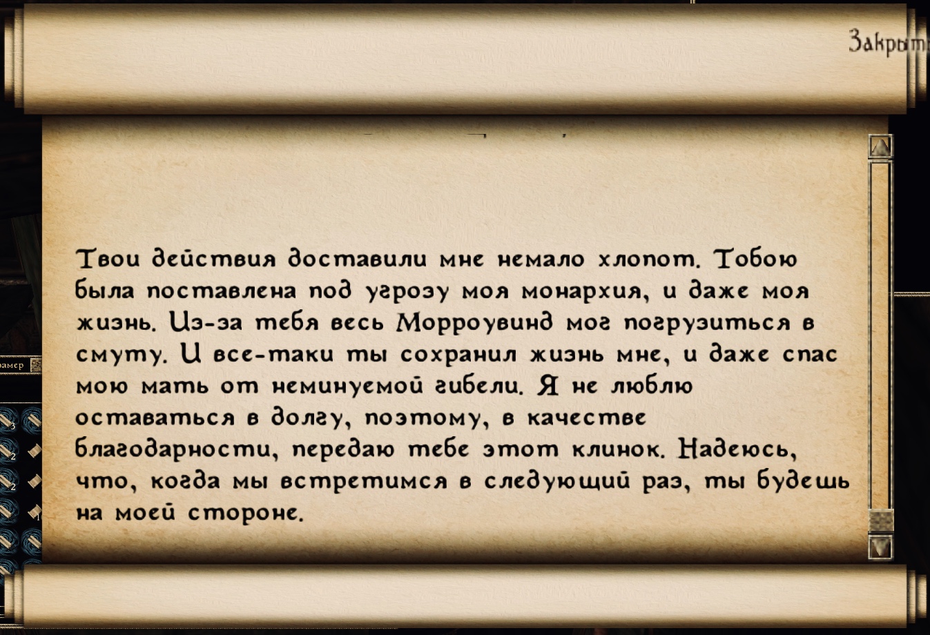 И снова охуительные твисты. Захватил Разделитель, уже готовил наступление на крепости Дагота и размещал в Альд’руне войско ординаторов, когда меня настиг гонец с письмом от анонима, приглашающего встретиться в «Черном шалке». Аноним оказался Селлусом Гравиусом, который переоделся в гражданское и слил инфу о готовящемся приказе устранения Нереварина. Это получается, что когда я вернулся бы с Красной горы с недобитками, меня бы встретили легионерские мечи. Неприятный поворот событий, хотя и весьма ожидаемый. Теперь Нереварин представляет реальную угрозу для Империи из-за моего растущего влияния на Морровинд - впервые за долгое время дома объединились против общего врага, и даже Храм по указке Вивека пошел на попятную и примирился с Апографистами. В Бал Исре даже открыли храм Азуры, впервые с незапамятных времен. Это что же получается, данмеры перестали сраться, у них есть народный лидер, так и до восстания недалеко. Глядишь щас еще сообразят чего и легионеров нахуй попрут, хотя я таких целей никогда не ставил и даже наоборот старался замирить Империю и данмеров.