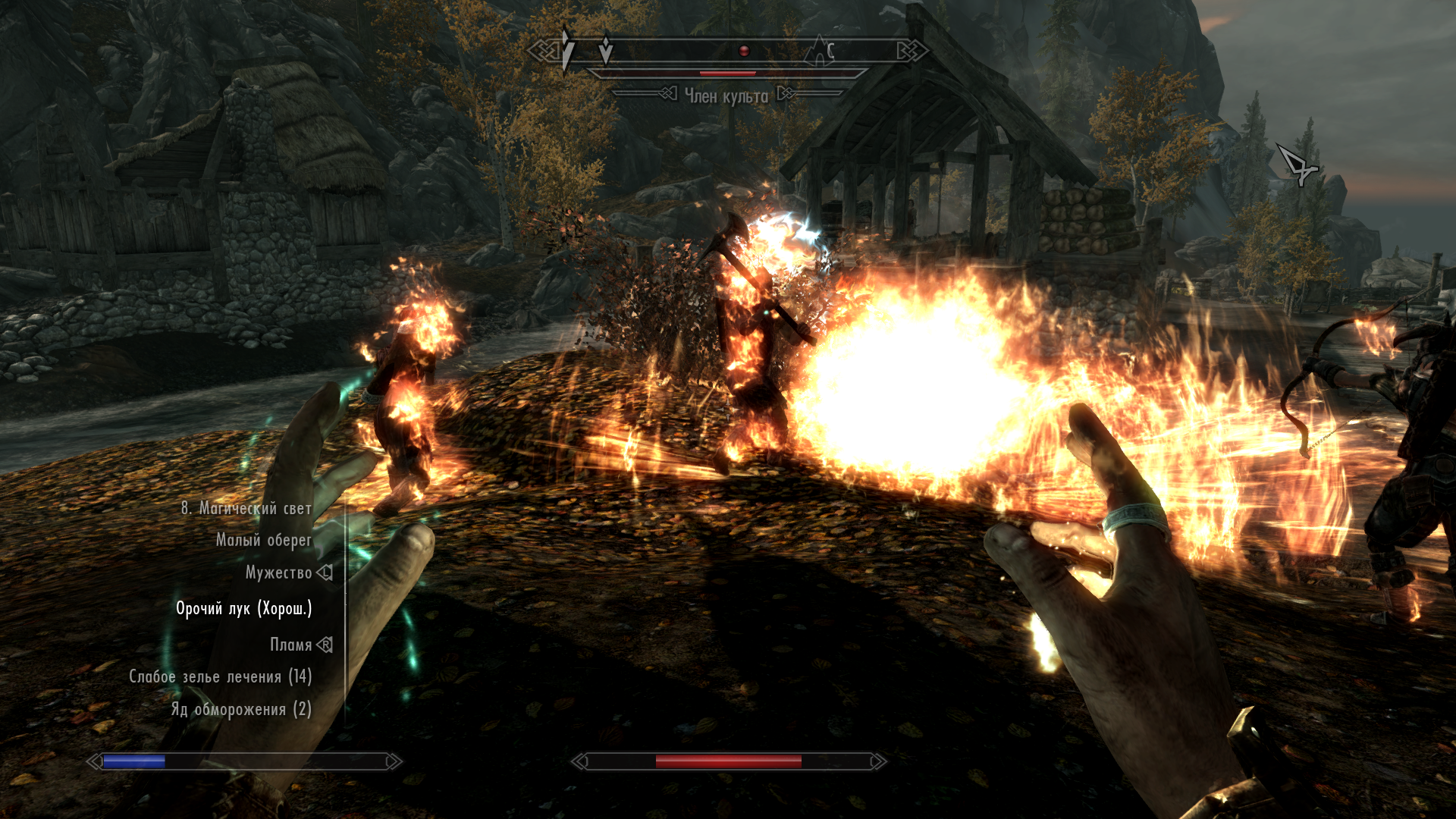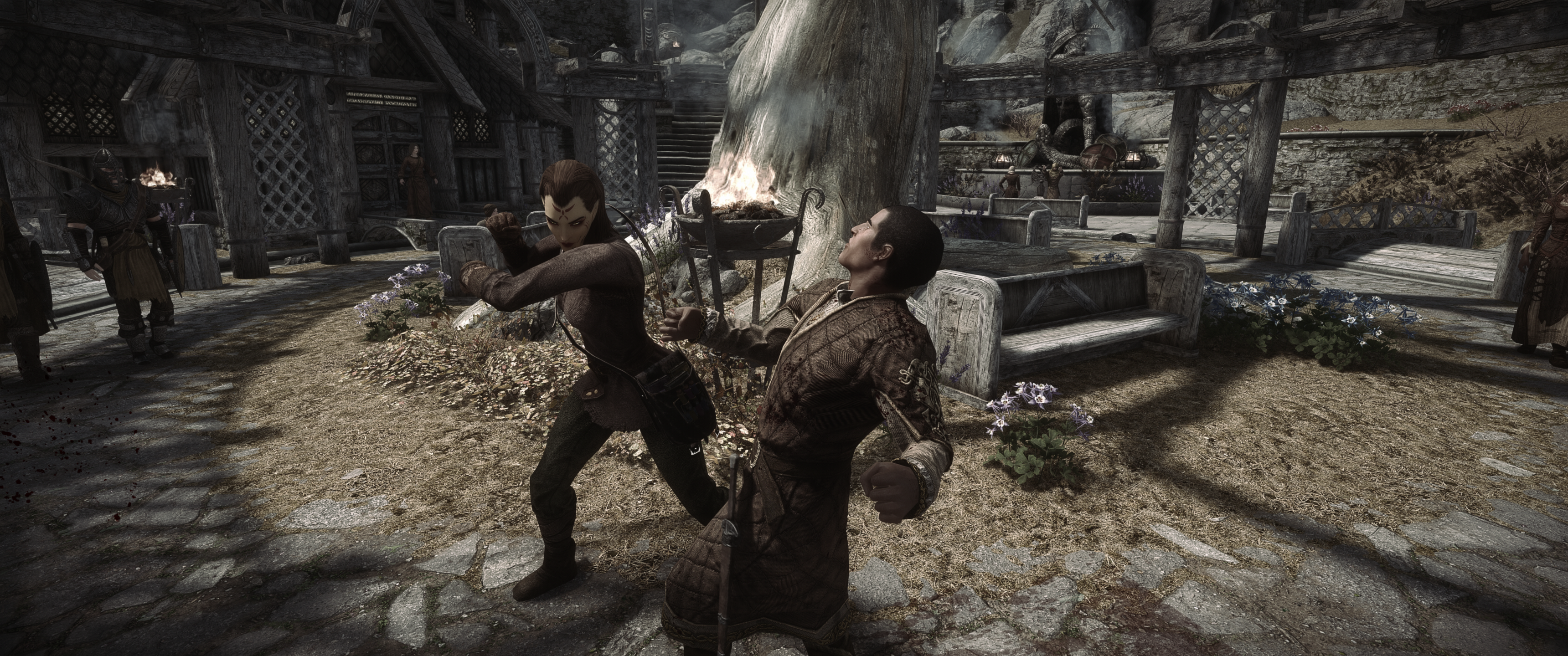 Еще запомнилось, как у последнего из Рук оказались охуительные дротики, зачарованные на все, что можно, и он меня ими обсыпал так, что я схватил слепоту, перегруз, и стоял дальше под обстрелом, верно приближаясь к смерти. В панике, стараясь сделать все что можно, чтобы не сдохнуть (прошел все кстати с одного трая без сейвлоадов, максимально держась такого правила) я скидываю с себя последние доспехи и спотыкаясь уебываю, ориентируясь на мини-карту. Когда ко мне вернулось зрение, я обнаружил, что половина залпов этого уебка отразилась в него же (атронах на васянке, хуле), он ослеп, перегрузился и ебнулся в воду, где я его без труда добил. Карма для быдла. Еще в битве в городе не обошлось без огня по зевакам (и я и они старались их как живые щиты использовать), обнаружил, что пока целился из лука по споткнувшемуся Ординатору, за мной с криками бежала ретивая данмерка, которая была отправлена спать ударом кулака в ебало.
