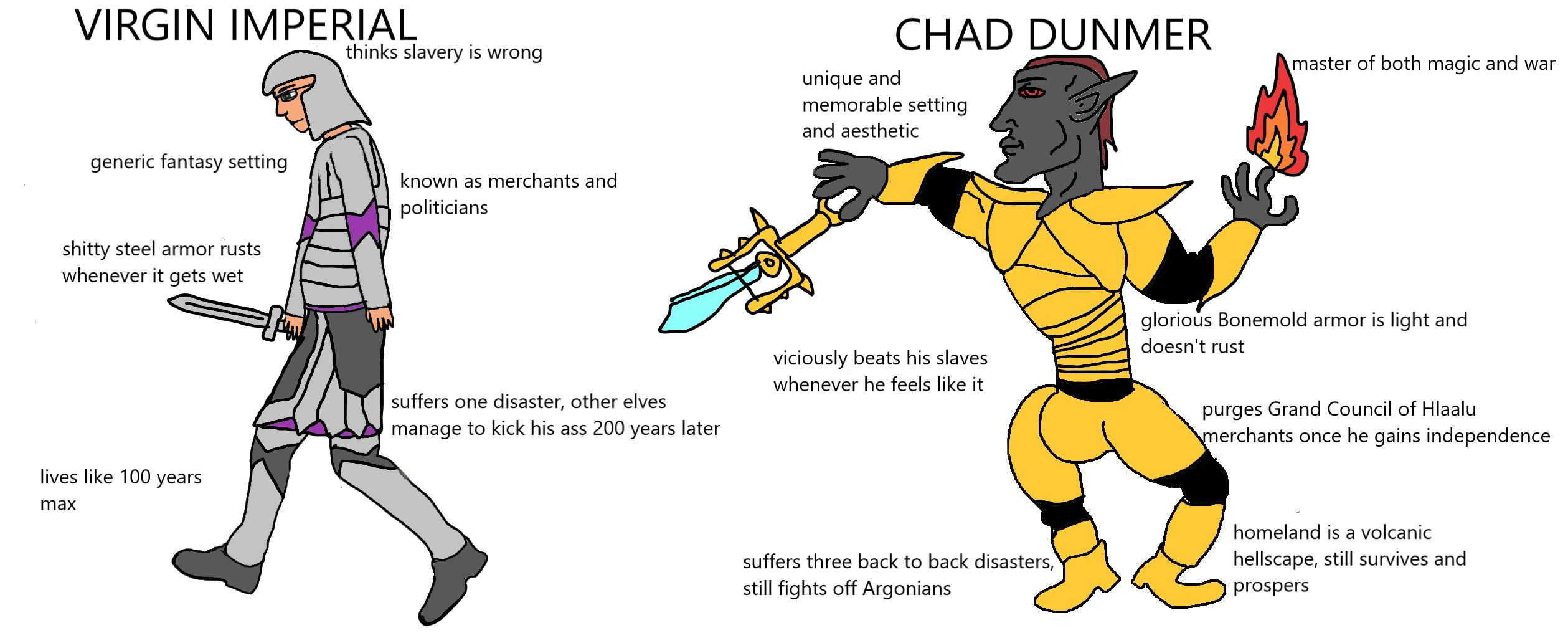 Под впечатлением появилась идея отыгрывать пикрила в Скайриме. Достаточно несложно, нужно понаставить модов и делать главный квест, втихаря прерываясь на еблю и аннигиляцию всех, кого захочешь. А че, завязка подходит - 200 лет не было драконорожденных, и вот откуда ни возьмись появляется благородный Довакин с обложки, герой, спаситель и конченный мудак за кадром, крошащий бандитов в фарш и взрывающий лавку торговца из-за прикольного лука, который ему понравился. Пусть это будет базированный имперец-гигачад, билд с упором на физуху и убийственные крики, типа урагана и вырывания души. Осталось только нормальный бэкграунд придумать, где гг будет расти в изоляции под присмотром каких-нибудь учоных или культистов, которые культивируют спасителя вселенной для своих целей.