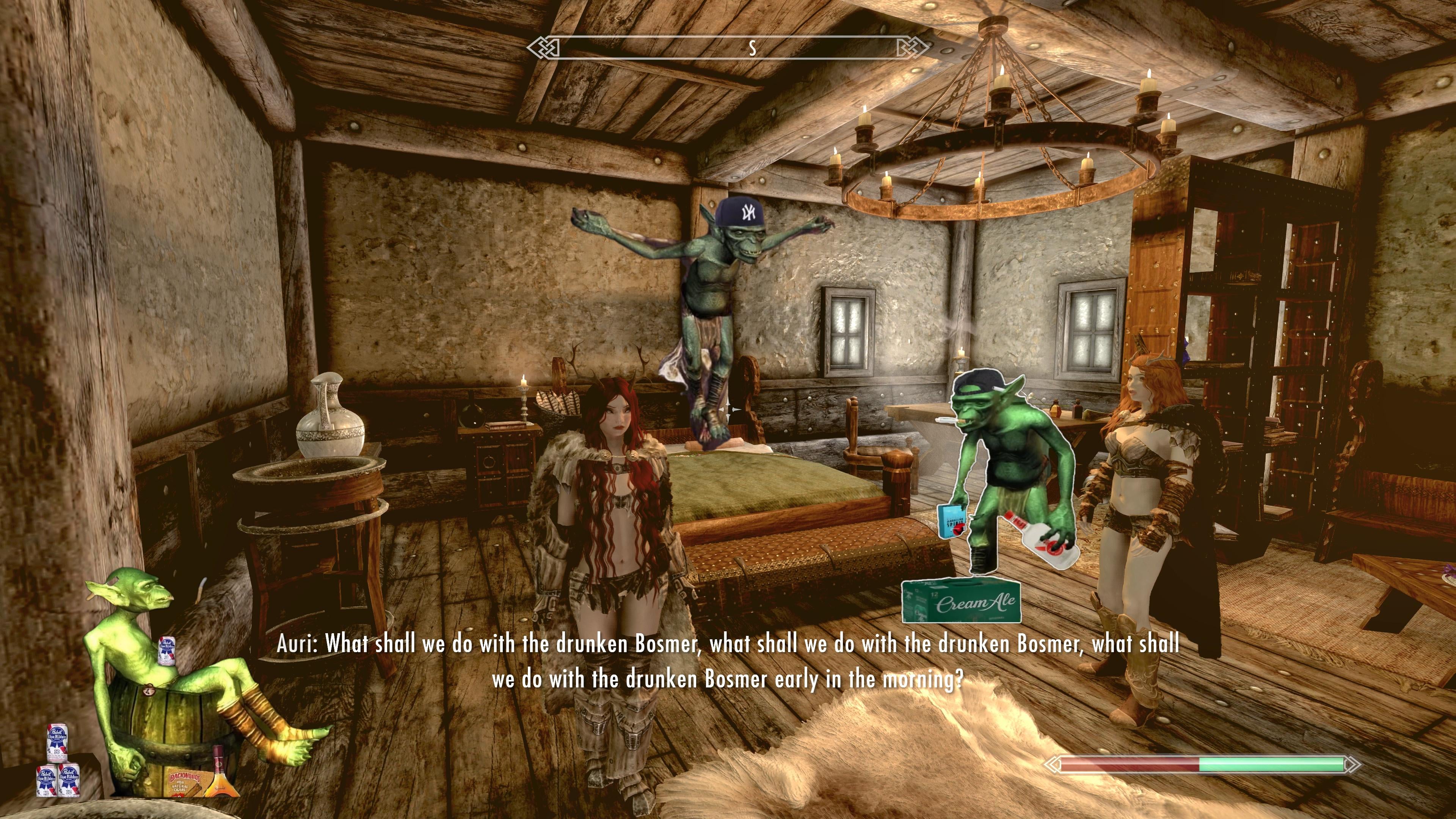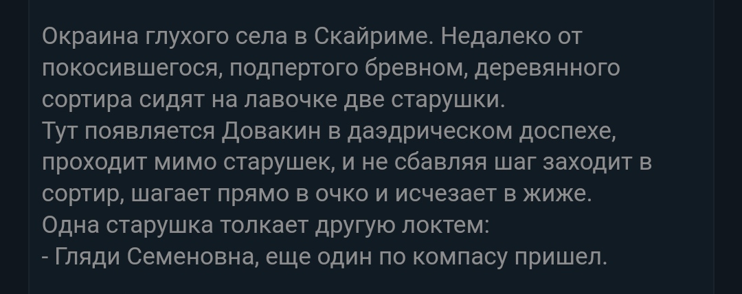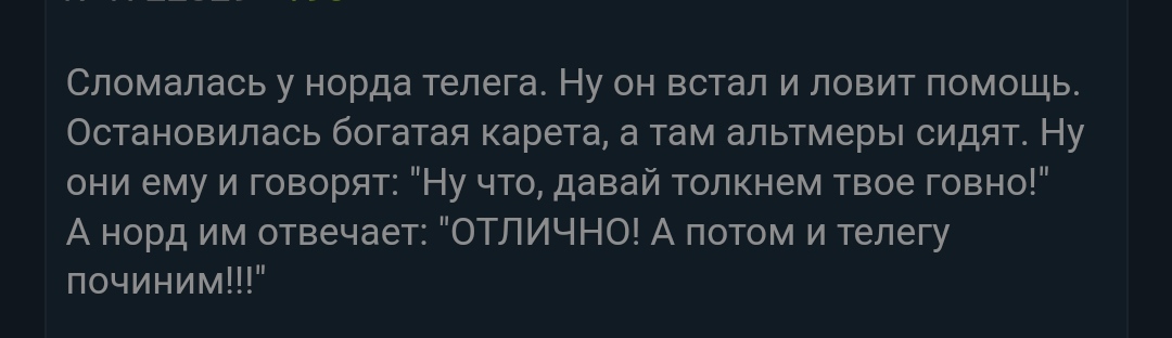 Случилась у молодого норда любовь с альтмеркой, так и так, жениться хотят. Приходит этот норд к пожилому отцу - ветерану Братьев Бури, спрашивает у него совета, а тот его наставляет на первую брачную ночь. - Так вот, сынок. Вот вернёшься с ней со свадьбы, ты не спеши валить альтмерку на кровать, подведи только и медленно разденься догола. - Батя, зачем? - А пущай посмотрит сначала на КРАСОТУ Скайрима! - Хорошо... - А вот далее бери её в охапку и кидай её на кровать! - Бать, а это зачем? - А пущай эльфка эта увидит СИЛУ Скайрима! - Ну ладно... - Вот! А когда кинешь на кровать - садись от неё поодаль на стул и начинай дрочить неистово! - Батя?... - А пущай смотрит и рубит на носу, шо Скайрим - это НЕЗАВИСИМОСТЬ!