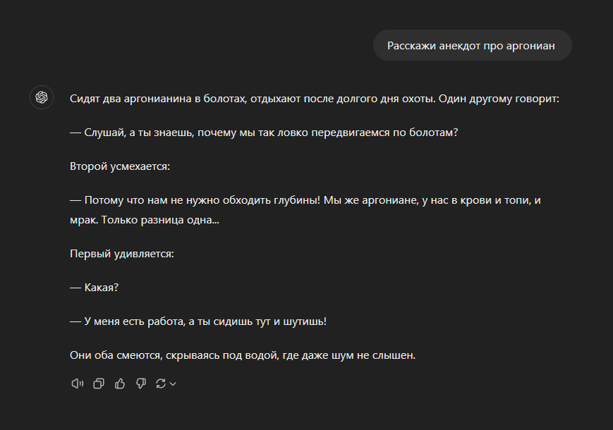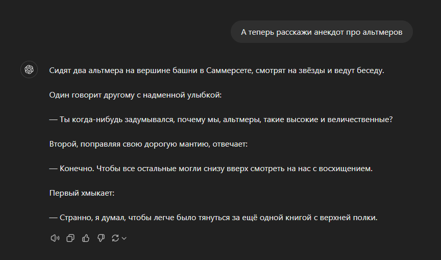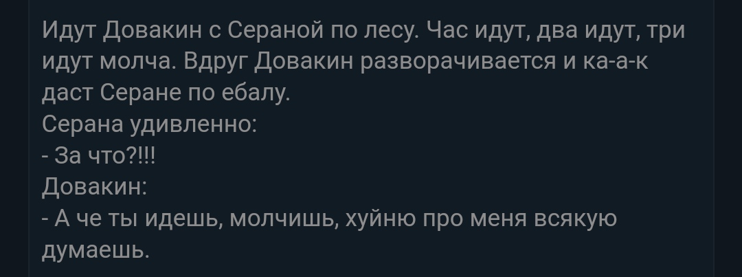 >>1937822 >они ж не постят нихрена Потому что в тесаче основной контингент это зумеры с уровнем когда осмелившись запустить мору унижаются грязекрабом и фуражиром квама. Плюс они не начитанные. Когда пытаешься переделывать совковые анекдоты или придумывать свои с отсылками к олдовым (и не оче олдовым) винам играм, книгам, фильмам, историческим событиям - никакой реакции. Они гыгыкают на я-покакал-в-Вайтране. Поэтому придумывать сюда анеки пустая трата времени.