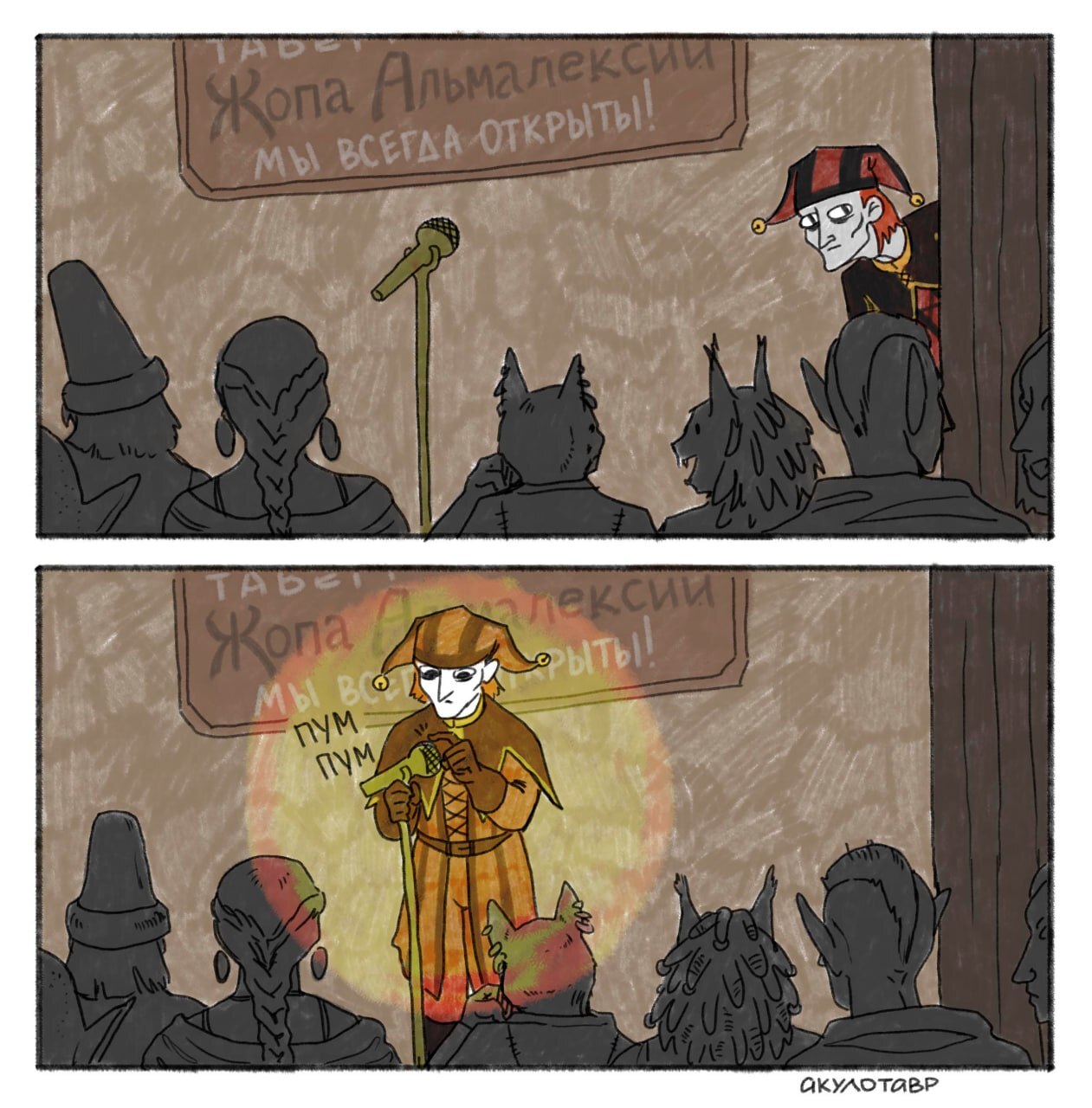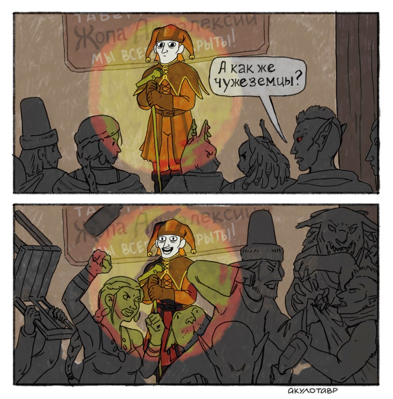 >>1942013 Идет альтмер по улице и видит большую очередь в какой-то домик. Интересно стало, подходит и спрашивает: - Что за очередь? - В комнату смеха. Кто ни выходит оттуда - все смеются. Видишь? Ну и он пристроился в очередь. Заходит в домик, а там Ульфрик Буревестник говорит про независимый Скайрим.