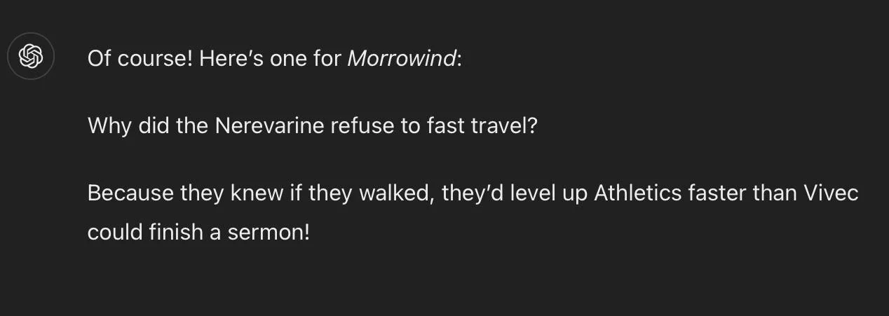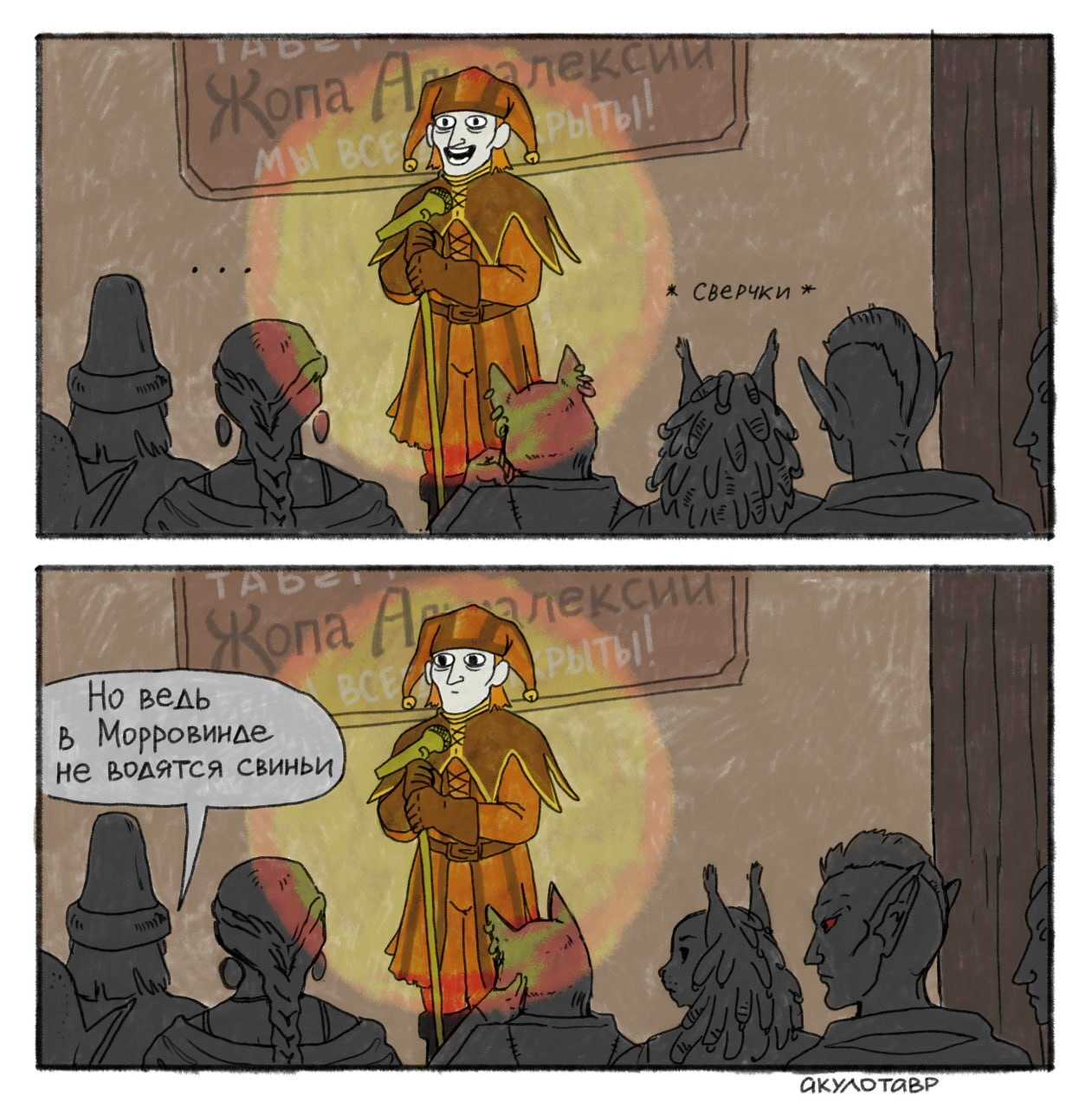 Сидят несколько старых данмеров за бутылкой суджаммы: - Раньше лучше было.. - Новых заклинаний уже не создают.. - Альма запретила левитацию.. - Вместо сосудов алхимии теперь стол с корявой картинкой.. - Молодые данмерки предпочитают каджитов и аргониан.. - Молодые данмеры - накаченных нордов.. - Вместо снадобий от ревматизма в храме предлагают веру в предков... - Суджамму разбавляют.. - Про Азуру н'вахи рисуют откровенную срамоту.. - А ей нравится..