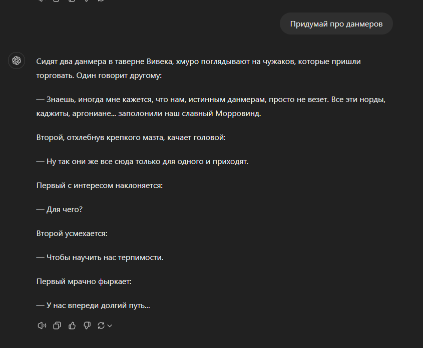 >>1968175 Да все выкупили. Просто после предложения "гомонорд женился" можно было и не продолжать. Само по себе анекдот. Поэтому остальное мало стыкуется. Надо было гомонорда на данмера поменять, получилось бы аутентичнее. Сидит данмер, дрочит, смотрит на жену-альтмерку и бухтит: "Чужеземцы ДОСТАЛИ!"