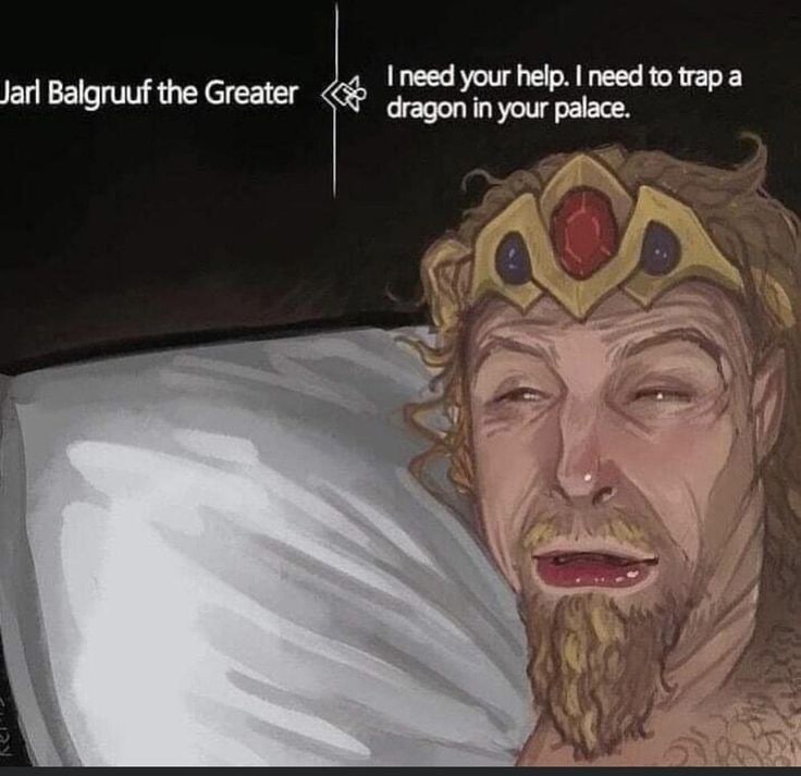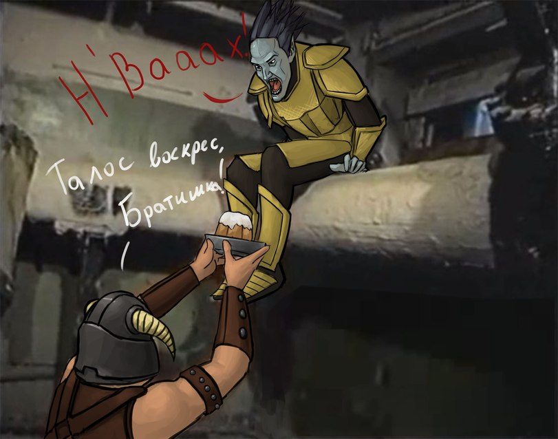 Приходит Довакин в дворец королей. - У меня послание к Ульфрику Буревестнику от ярла Балгруфа. Выходит Галмар в БДСМ прикиде. - Нет, посланник, Ульфрик не может с тобой поговорить, он очень занят. - Да мне на три слова всего.