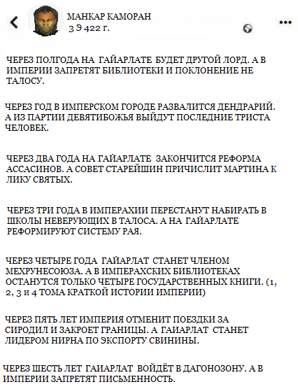 - Новой религией утверждается культ Мифического Рассвета Империи, ярко красные балахоны становятся новым дресскодом правящей династии. Манкар Каморан становится первым советником Императора с доступом к его покоям.