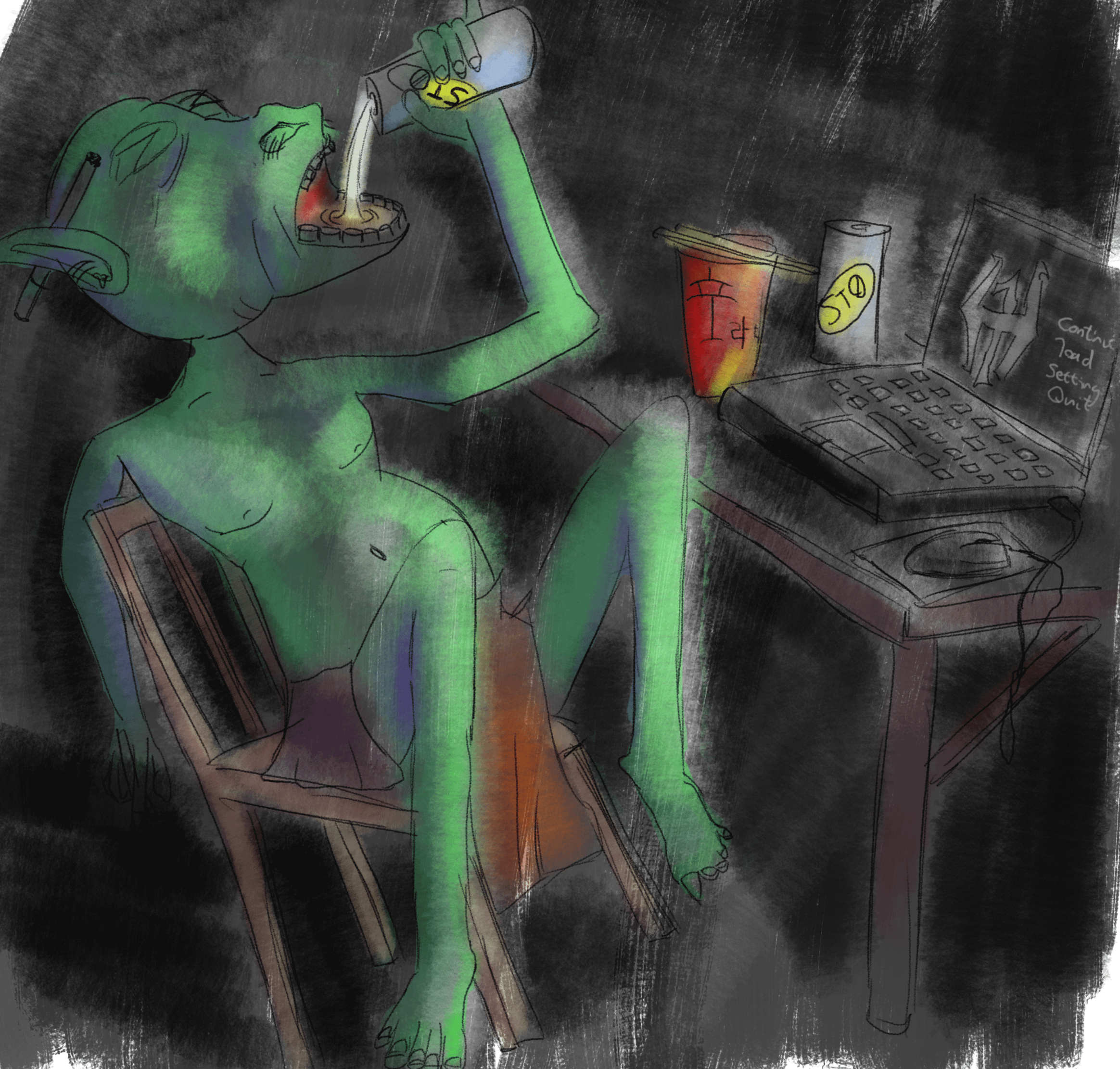 Наутро Йопку нашли во дворе. Он сидел, прижавшись спиной к трубе печки, с дико выпученными глазами. В руках он сжимал листок бумаги, исписанный теми же словами, что и в игре. А в избе, на столе перед монитором, стояла говнястая сиська багбира.