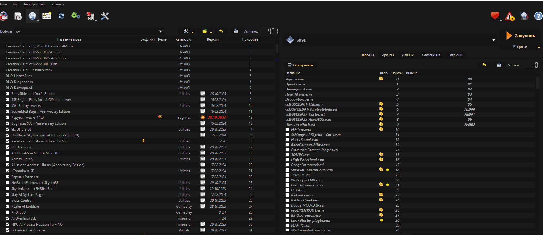 Анон, а Bethesda Plugin Manager for Mod Organizer https://www.nexusmods.com/skyrimspecialedition/mods/111236 не приводит у тебя к проблемам? Например, отключение плагинов при запуске МО2 или лоадордер не обновляется при отключении-включении модов?