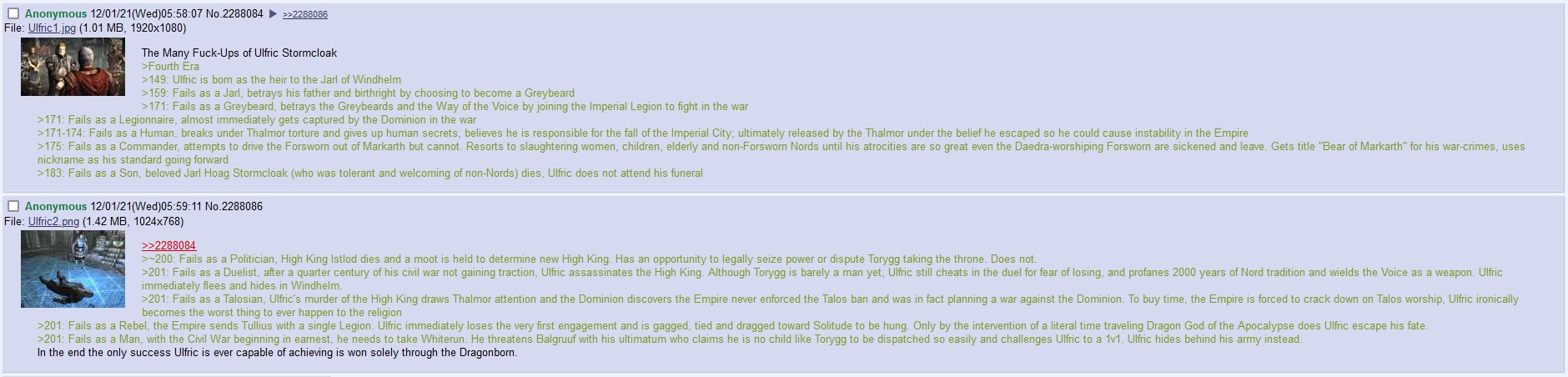 >>2027641 Судя по тому как опустился уровень дискуссии, аргументов ты не заготовил и перешёл просто к унылым оскорблениям, очень жаль от имперца ожидаешь более продвинутой дипломатии. >совет избрал Торуга верховным королём А корона верховного Короля у него была? Нет? Совет и раньше выбирал королей и мнение разделялось, не всегда выбор совета был легитимным, предки Йорунна были избраны так же как и предки Сваргримма, оба избраны советом верховным королём, итог Скайрим был разделён и имел две столицы, Солитьюд и Виндхельм, ничего не напоминает? https://en.uesp.net/wiki/Lore:Crown_of_Freydis >потребовал от короля поединок Который Торуг принял раз попал в Совнгард, как и полагается воину в бою. >совершил подлое убийство голосом Нет, Ульфрик не знает туума способного убить одним криком сразу на месте, ему известна обычная фусрода и обезоруживание, фусрода наносит 10 единиц урона при максимальной зарядке, она бы не убила Торуга c 50HP, к тому же даже сам Ульфрик говорит что добил его мечом. At Helgen, they said you shouted the king to death? "Not entirely true, though not entirely false either. Any Nord can learn the Way of the Voice by studying with the Greybeards, given enough ambition and dedication. My shouting Torygg to the ground proved he had neither. However, it was my sword piercing his heart that killed him." Чтобы избежать эффекта фусроды достаточно вовремя поставить блок, иметь хорошее здоровье или владеть вардом, это всё доступно любому и не требует особых практик у Седобородых, у Торуга были все шансы пережить атаку, если бы он был настоящим воином или магом, но он был жалким соломенным чучелом и марионеткой Империи неспособным стоять на ногах, такой король не нужен Скайриму в трудный час так же как Сиродилу не нужен был Тулес Бессмысленный на Рубиновом Троне и его сверг Тит Мид несмотря на то что Тулеса избрал Совет Старейших новым Императором. Это факты.