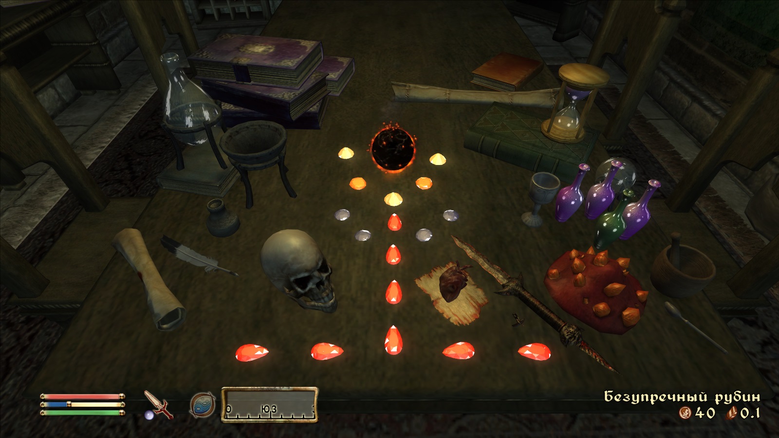 Немного подшаманил над своей оккультной лабораторией. Даэдрическое сердце заменил на человеческое, так как человеческие жертвы более лакомые. Далее рисунок будет дополняться по мере нахождения новых драгоценных камней. Ах да, рубины символизируют кровь, дальше сами догадаетесь.