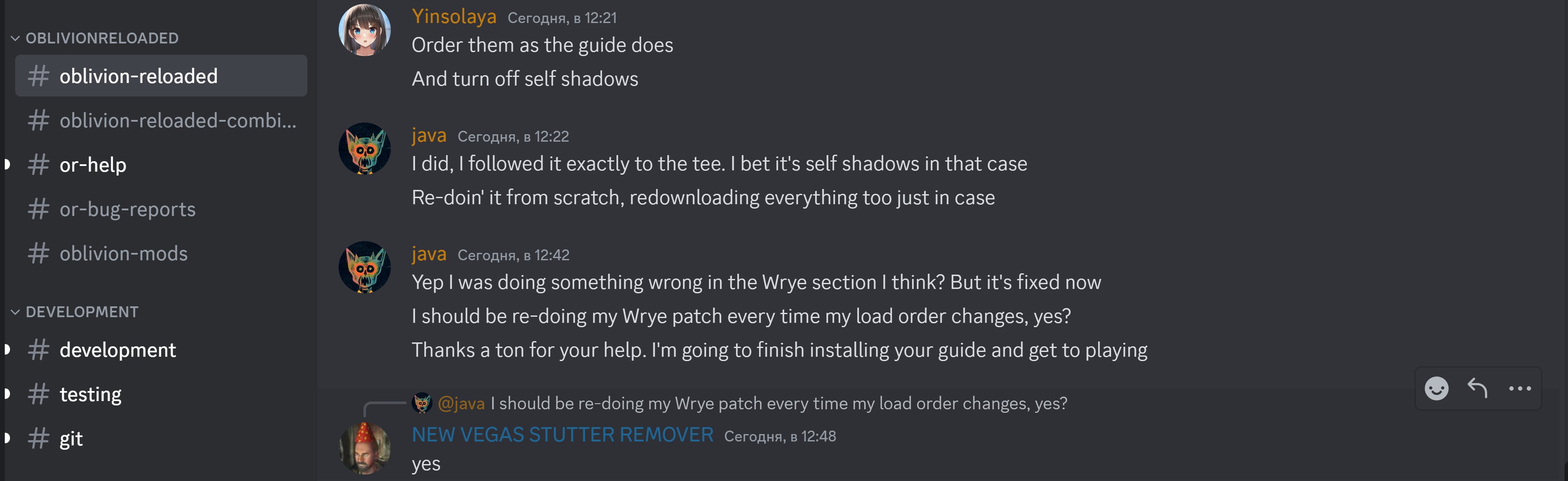 >>1965065 Ну я сборками не пользовался, однако с установкой и сортировкой модов у меня более чем за 15+ лет никогда не возникало, поэтому думаю могу дать советы. OBMM - это устаревшая параша. Подозреваю, что авторы сборки используют его для установки OMOD, для которых не нашлось конверсии BAIN или FOMOD на Нексусе. Однако, если хорошо поискать, то практически все есть в нужном виде. Например, Darnified UI на оригинальной странице мода есть только в виде OMOD и простого ZIP, но если вбить в поиск на Нексусе DarnUI Bain или FOMOD, то найдется нужная версия с просто инструкцией. Забыл сказать, что OBMM раньше использовался еще потому, что в нем нужно было делать валидацию текстур. Но я ей не пользовался и все было норм, к тому же сейчас есть OBSE плагин SkyBSA. Для моддинга Обливиона по сути нужен только Wrye Bash и LOOT Установил через Wrye Bash модов, прогнал через LOOT порядок загрузки и сделал Bashed Patch. По такой схеме я всегда все устанавливаю и все работает супер. Но тут оговорка, что у меня модлист обычно состоит максимум из 30-40 модов без разных оверхолов друг на друга установленных.