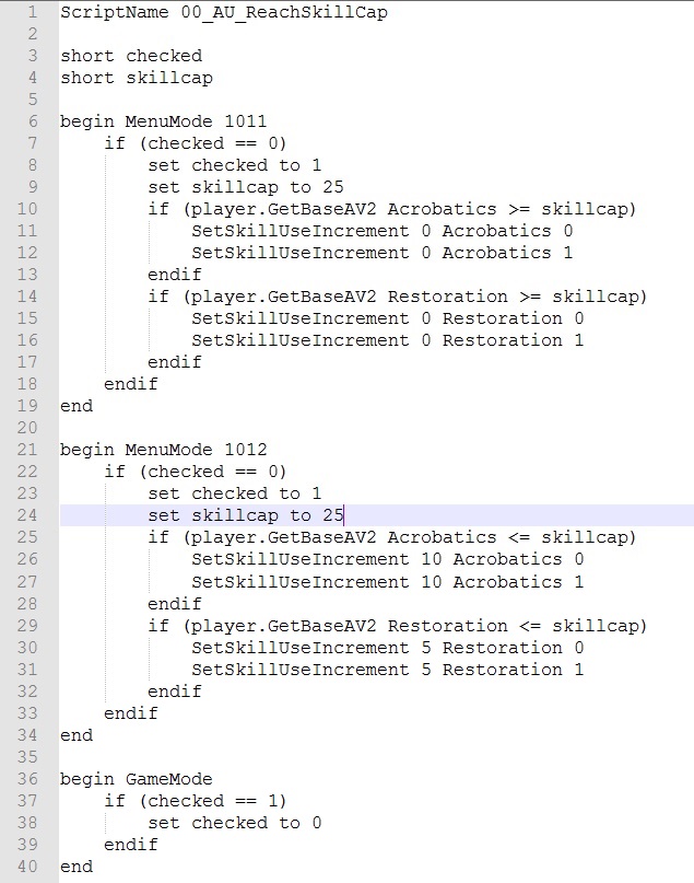 set currentSkillLevel to player.getav (ПроверяемыйНавык) ; destruction? if GetGameLoaded || GetGameRestarted set fQuestDelayTime to 20;; раз в 20 секунд set lastCheckedSkill to currentSkillLevel endif